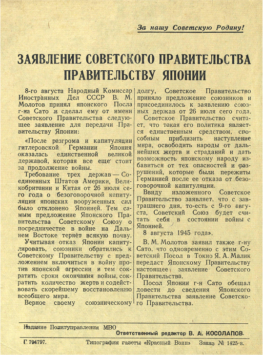 Выполняя союзнические обязательства, СССР в ночь на 9 августа 1945 вступил в войну против Страны восходящего солнца.