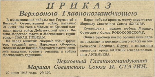 - Для участия в параде в городе Москве в честь победы над Германией выделить от фронта сводный полк.