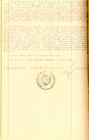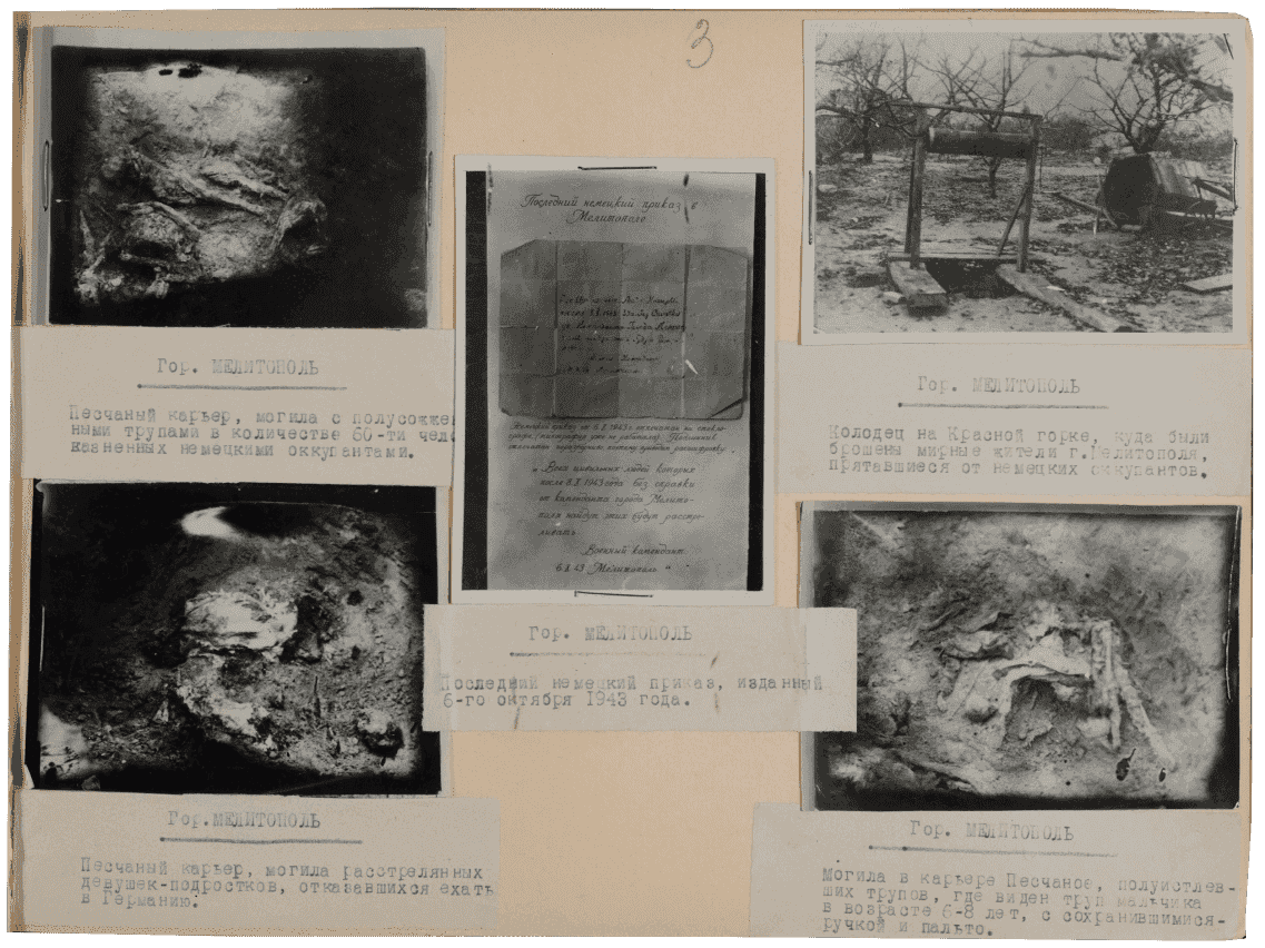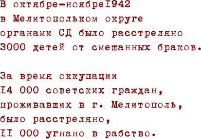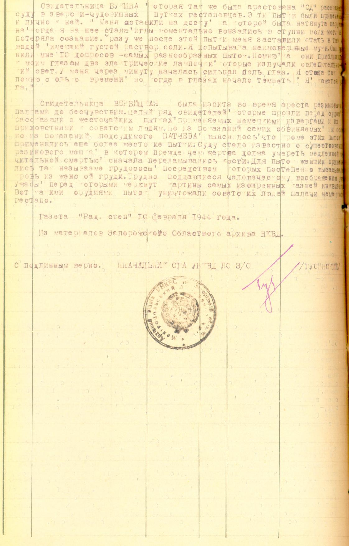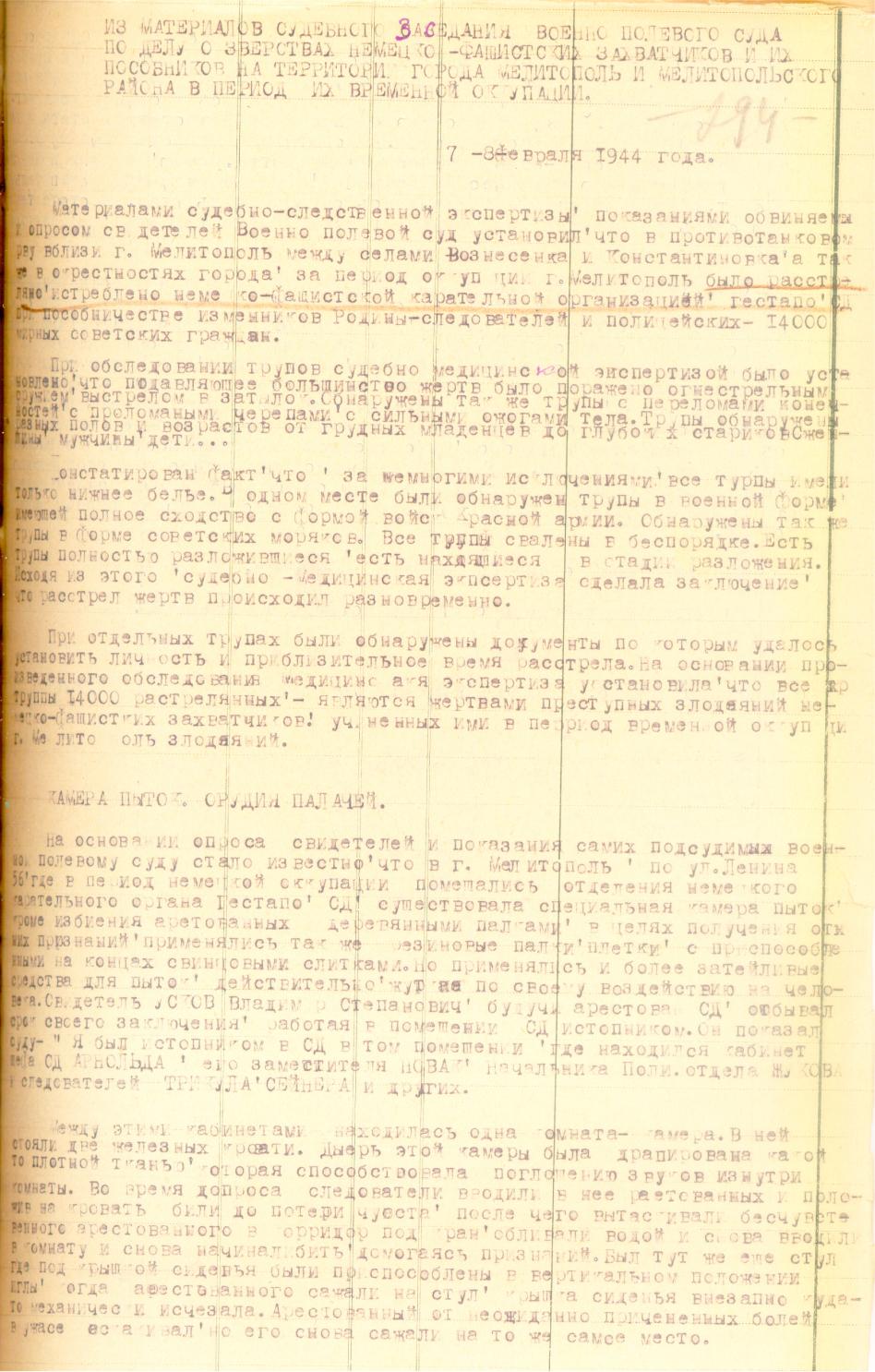 «В г. Мелитополь по ул. Ленина 56, где в период немецкой оккупации помещались отделения немецкого карательного органа Гестапо СД существовала специальная камера пыток, кроме избиения арестованных деревянными палками, в целях получения от них признаний, применялись также резиновые палки «плетки» с приспособленными на концах свинцовыми слитками»…