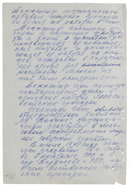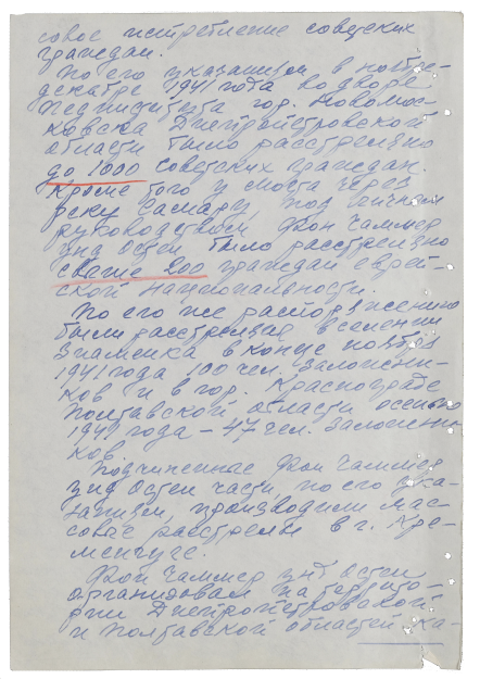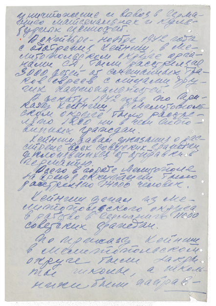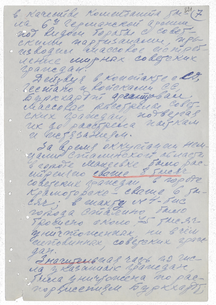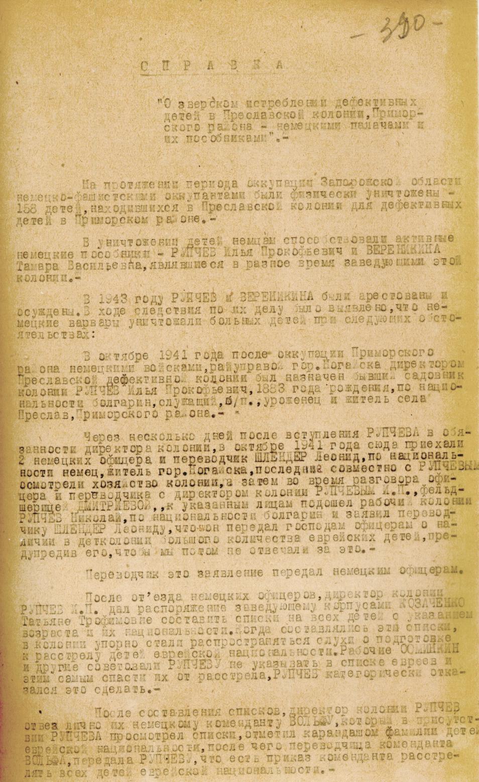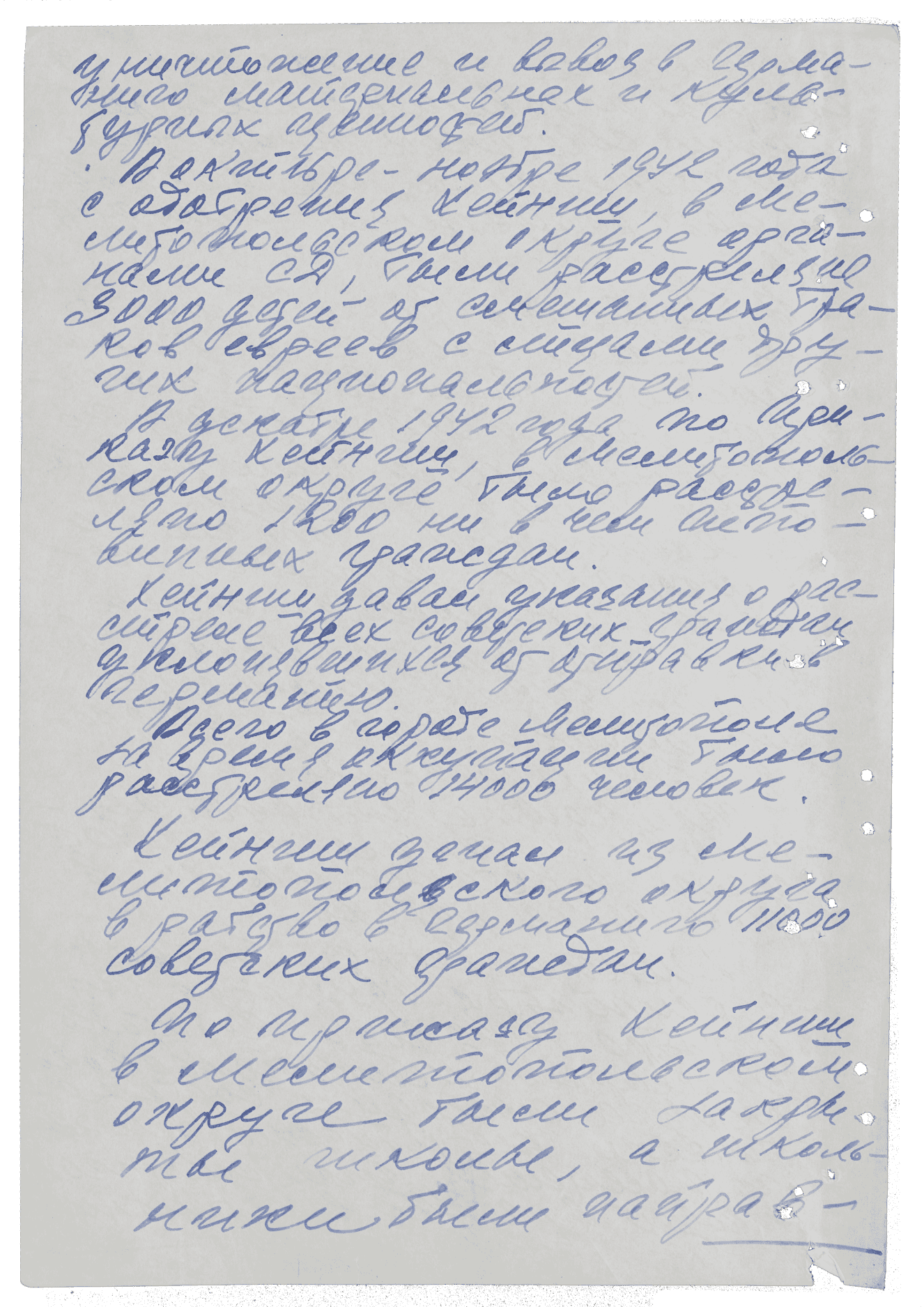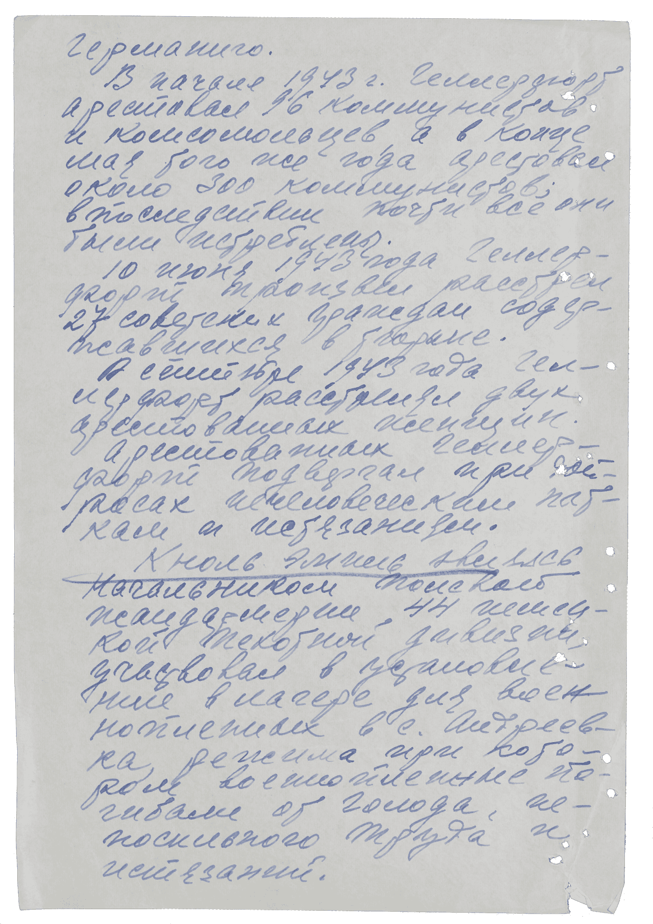 «В г. Мелитополь по ул. Ленина 56, где в период немецкой оккупации помещались отделения немецкого карательного органа Гестапо СД существовала специальная камера пыток, кроме избиения арестованных деревянными палками, в целях получения от них признаний, применялись также резиновые палки «плетки» с приспособленными на концах свинцовыми слитками»…