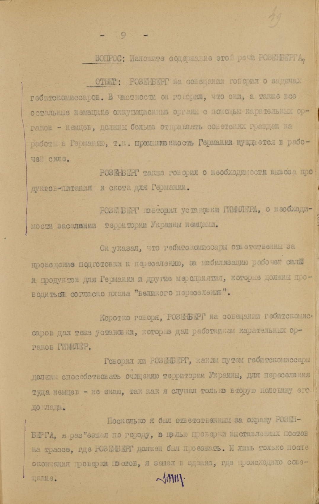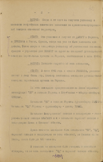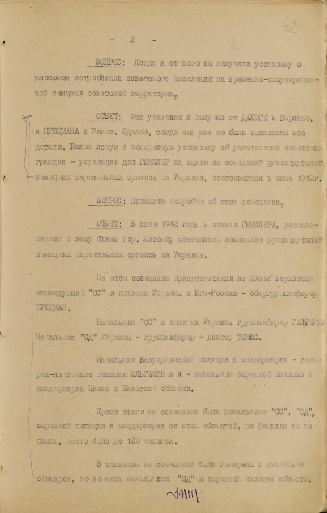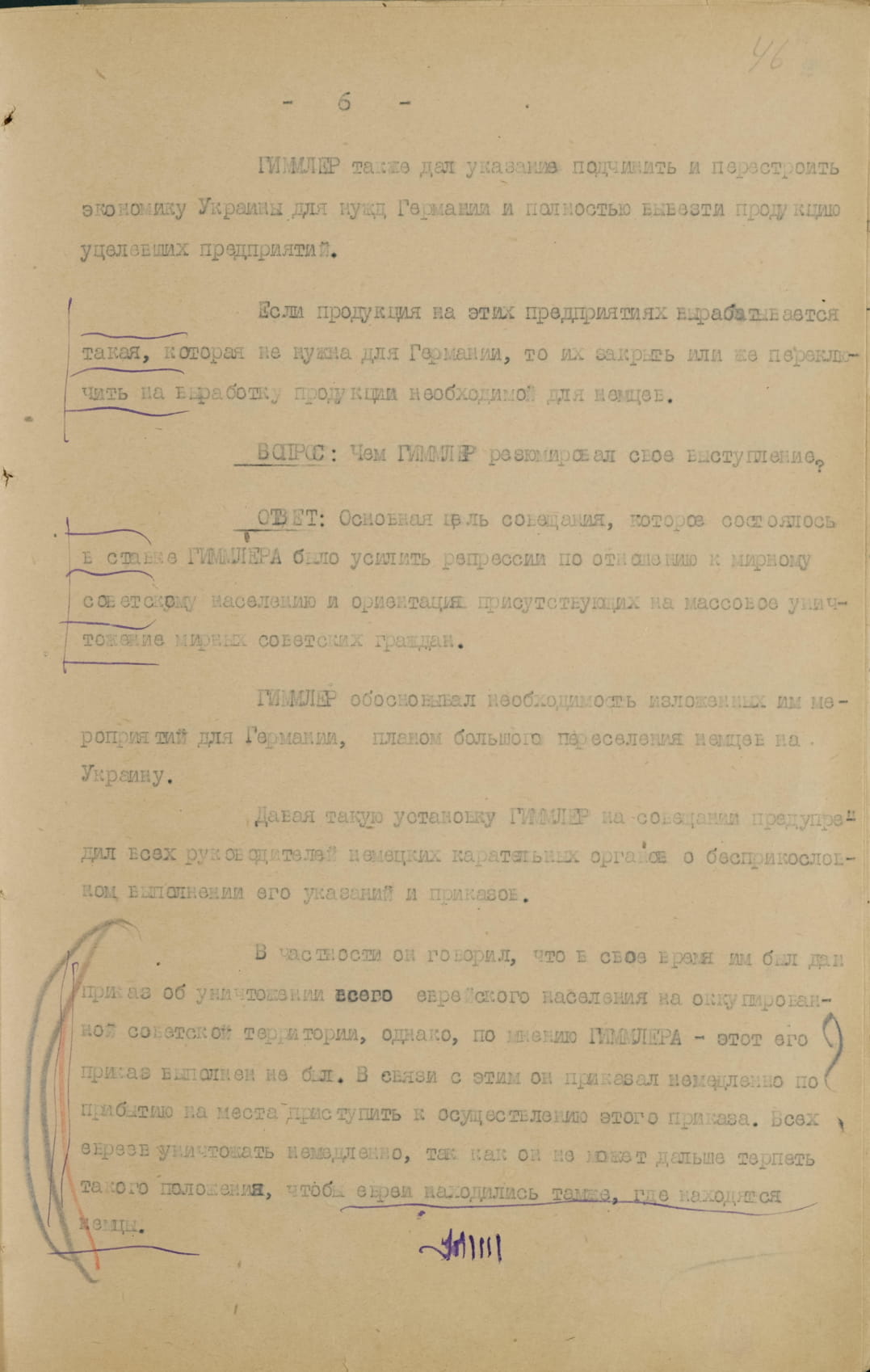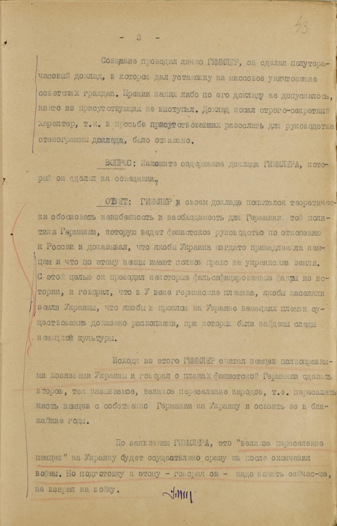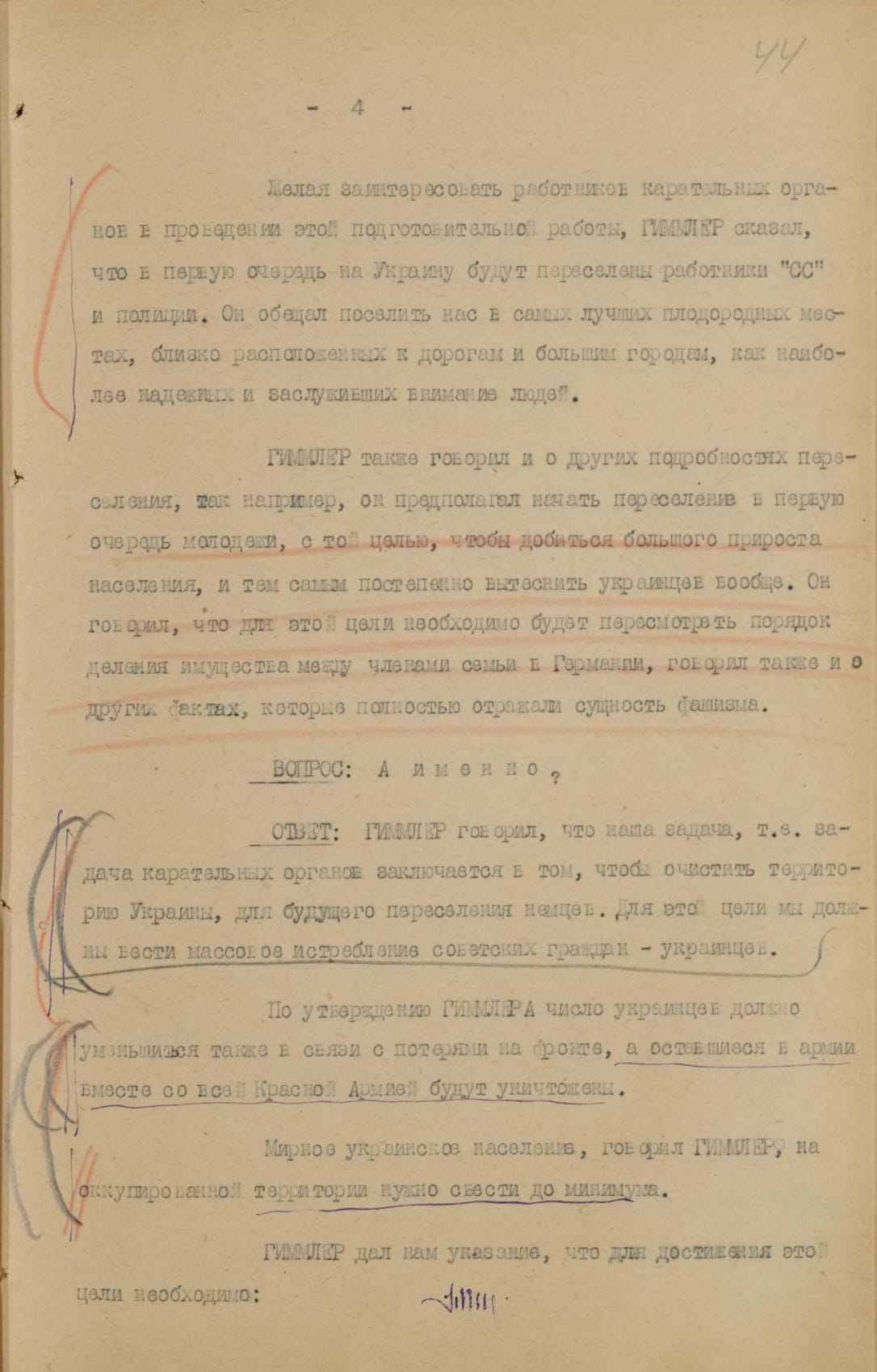 Гиммлер говорил, что наша задача, т.е. задача карательных органов заключается в том, чтобы очистить территорию Украины, для будущего переселения немцев. Для этой цели мы должны вести массовое истребление советских граждан – украинцев»…