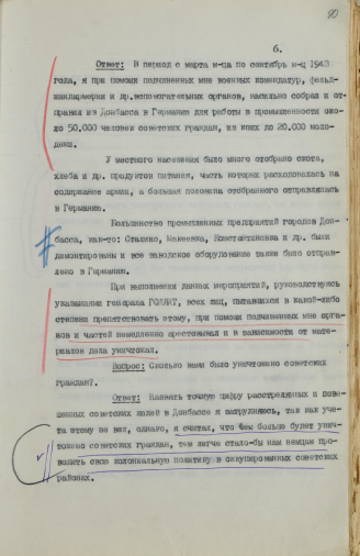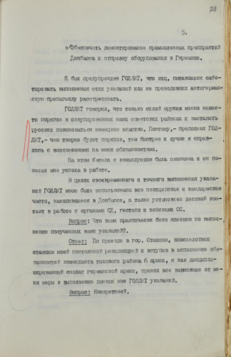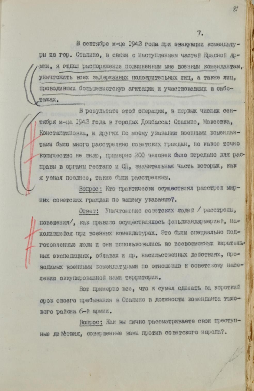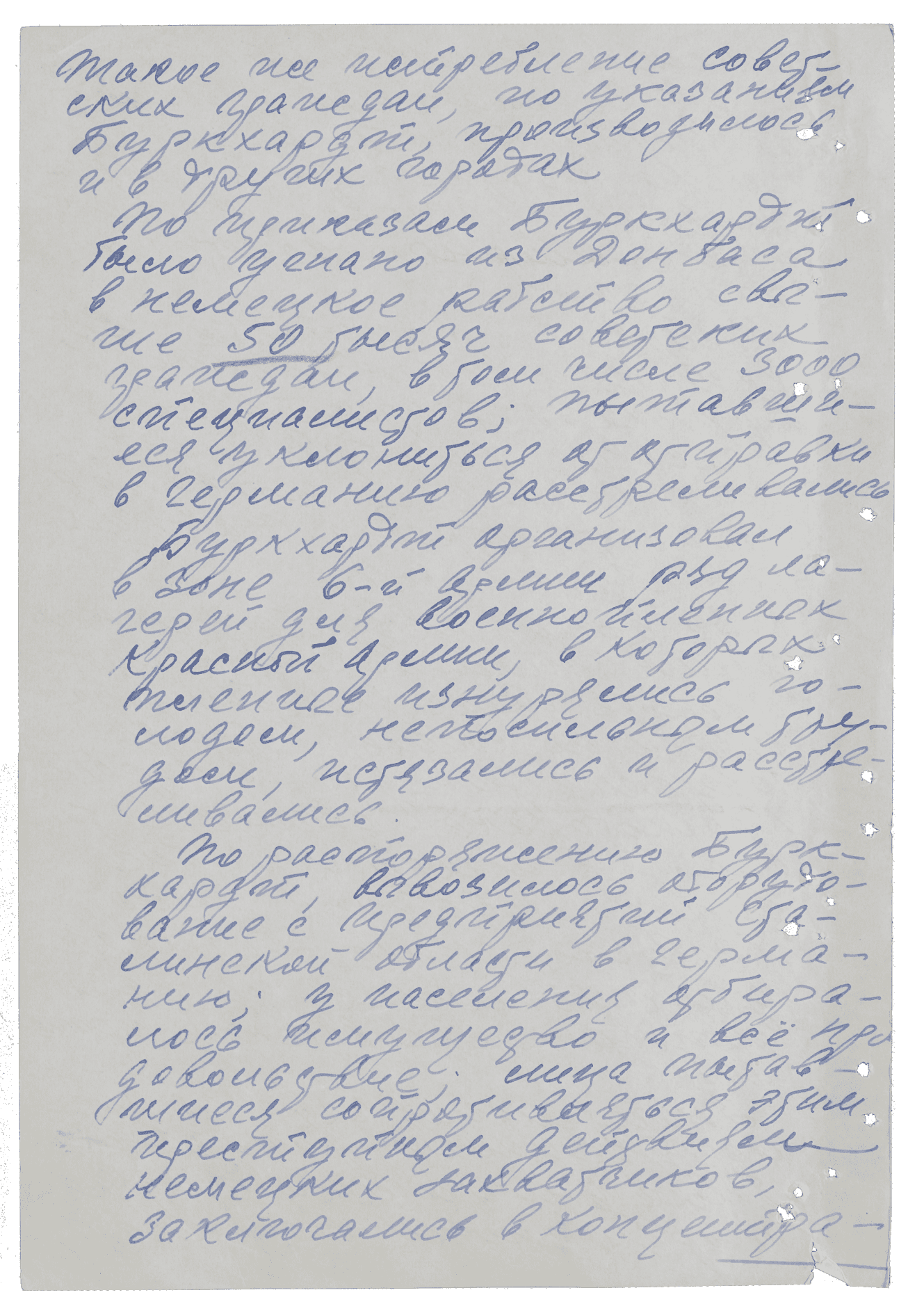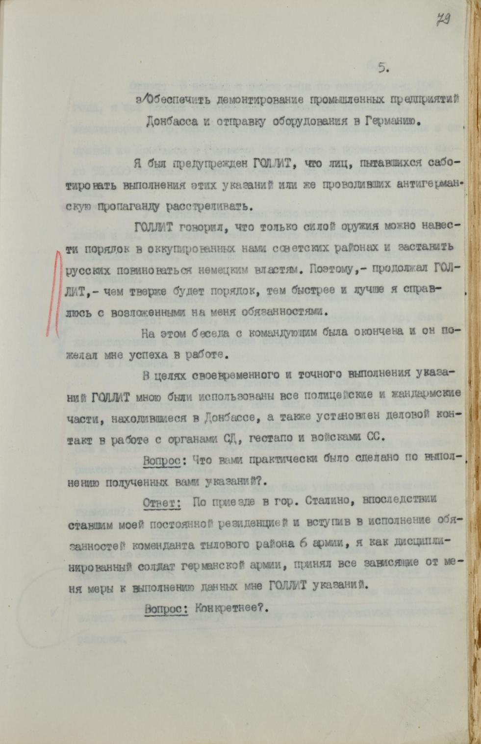«По приезде в гор. Сталино, впоследствии ставшим моей постоянной резиденцией и вступив в исполнение обязанностей коменданта тылового района 6 армии, я как дисциплинированный солдат германской армии, принял все зависящие от меня меры к выполнению данных Голлит указаний». К. Буркхардт