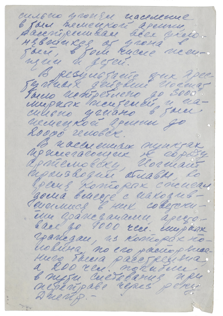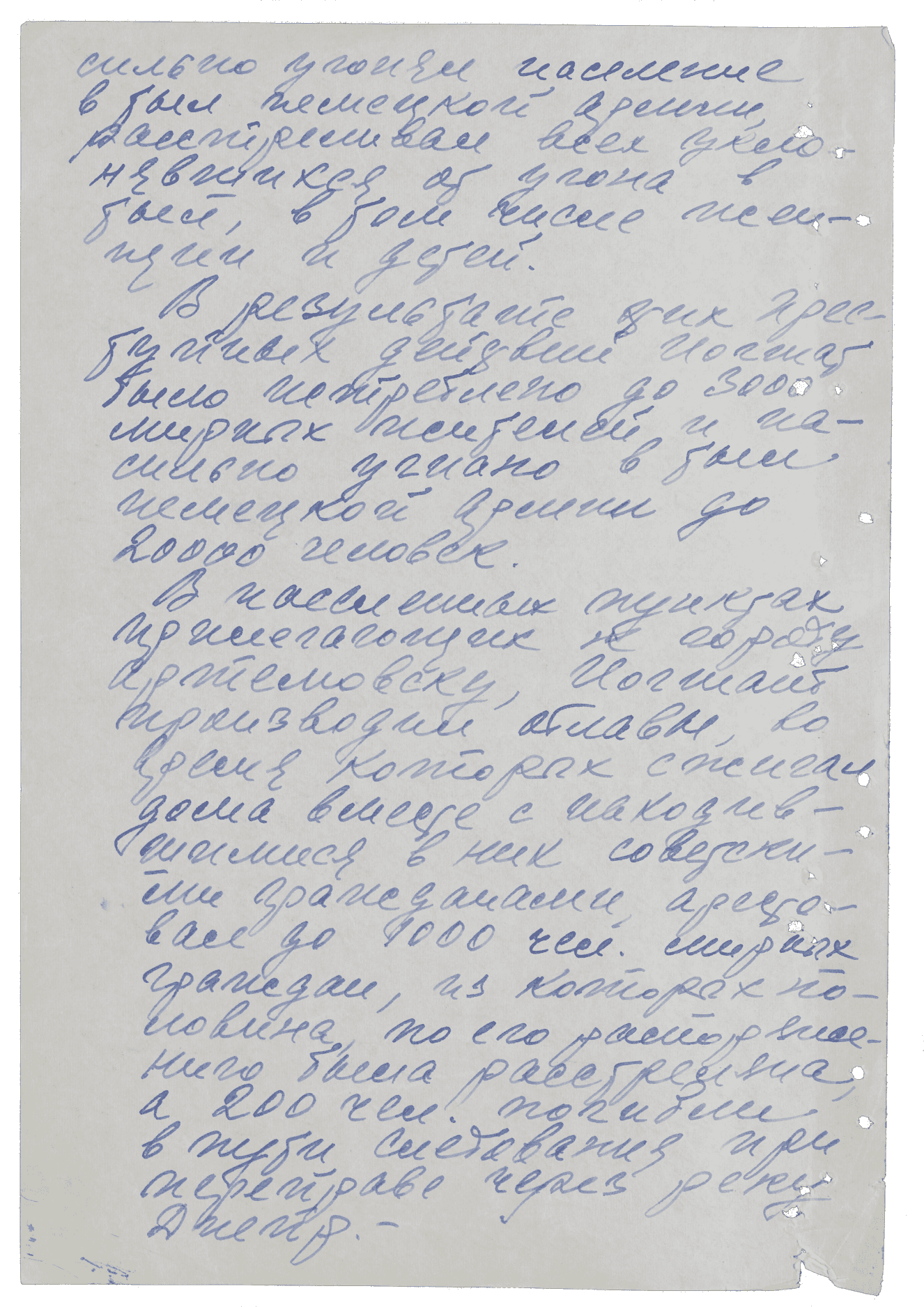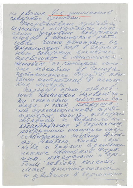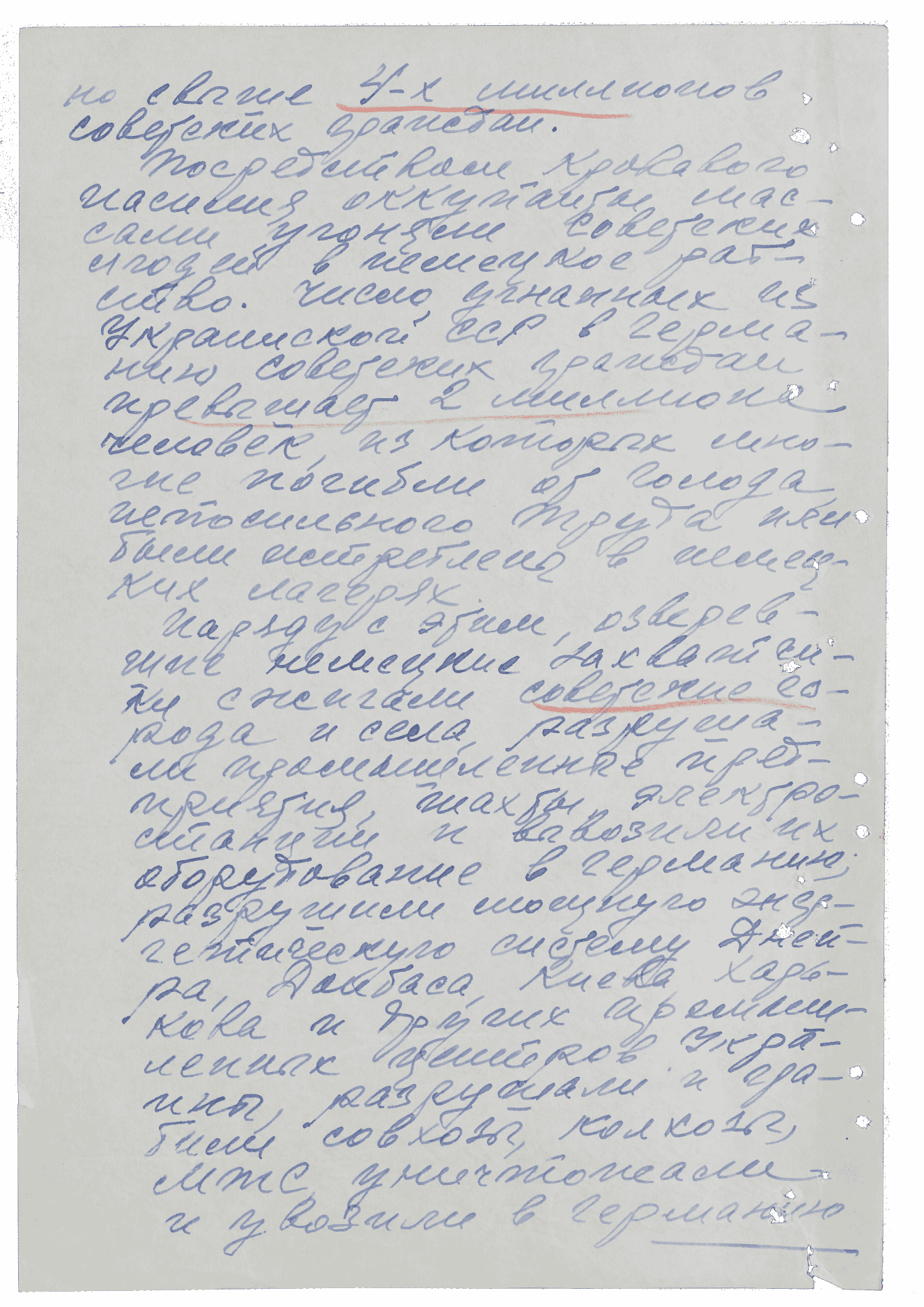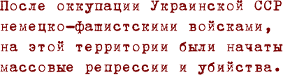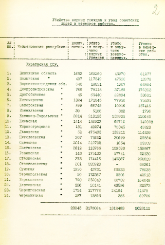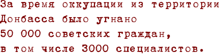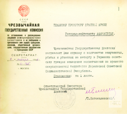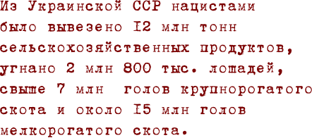 Из справки Чрезвычайной государственной комиссии по установлению и расследованию злодеяний немецко-фашистских захватчиков главному прокурору Красной армии генерал-лейтенанту Афанасьеву от 7 января 1946 о количестве замученных, убитых и угнанных на работы в Германию советских граждан на временно оккупированной территории УССР.