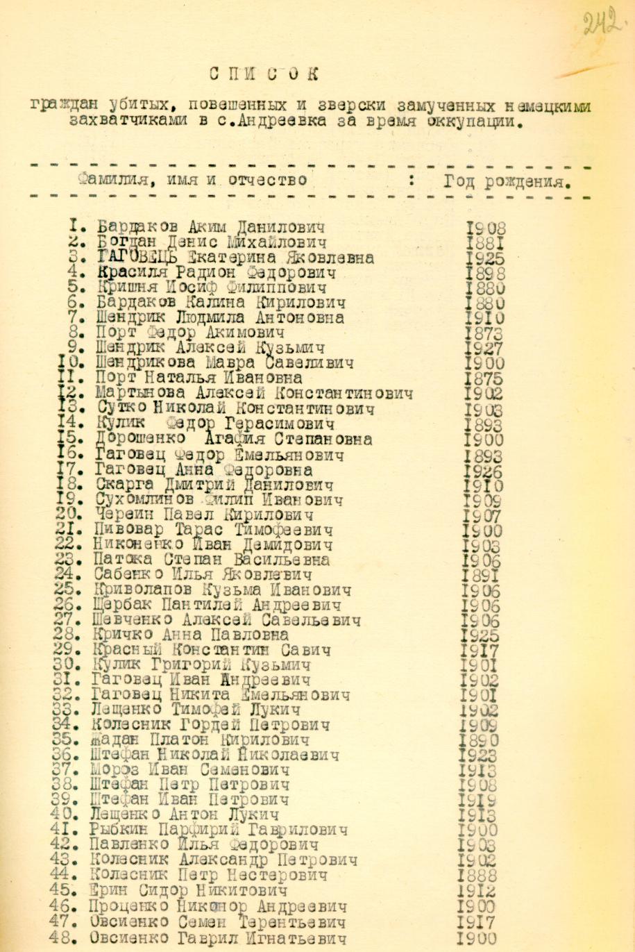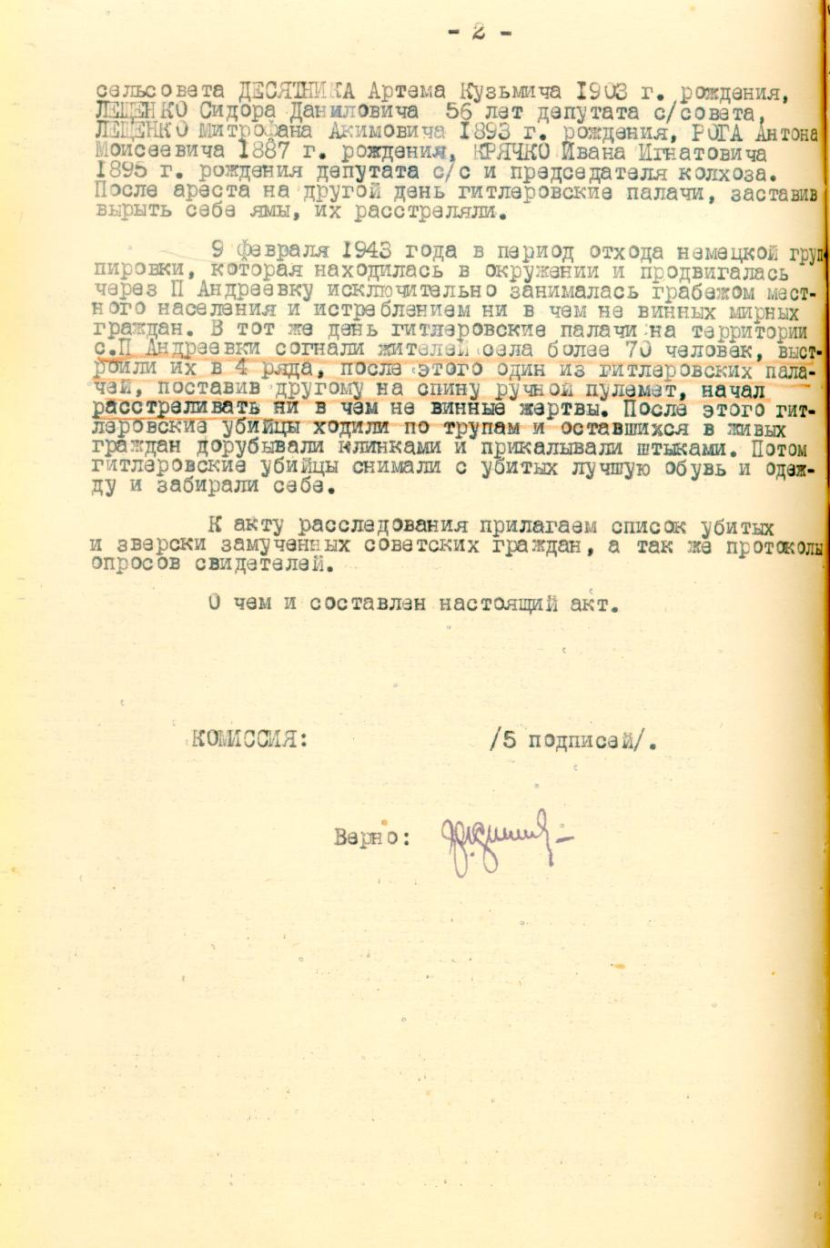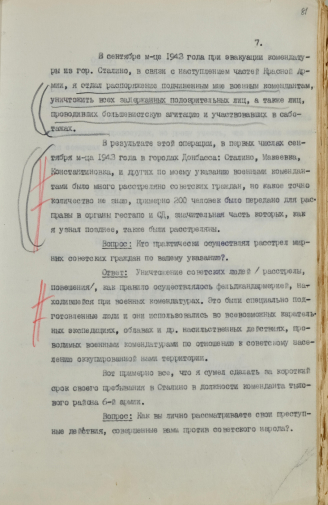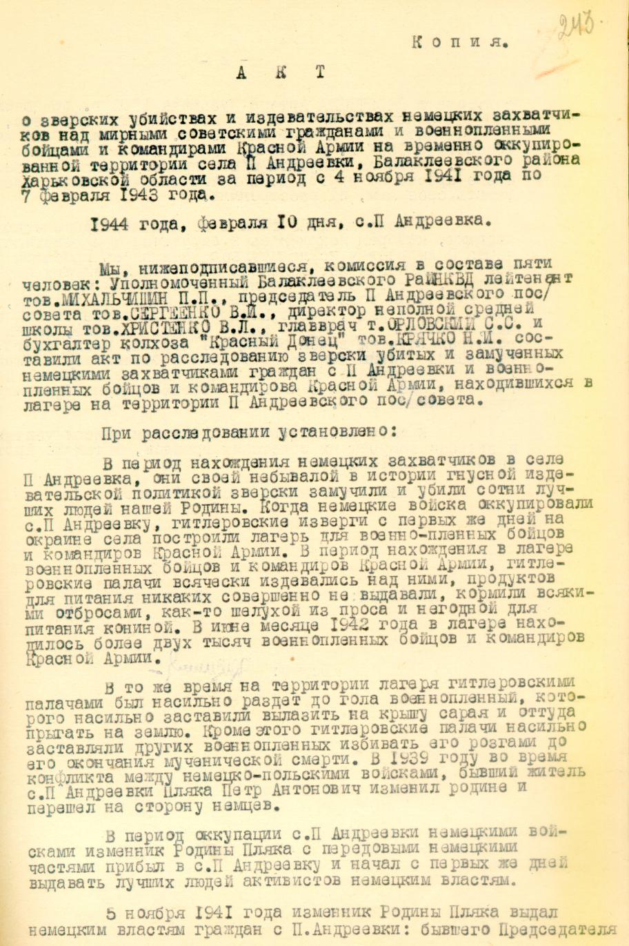 Будучи комендантом лагеря военнопленных в с. Андреевка, Балаклеевского района, Харьковской области создал в лагере такие условия для военнопленных, в результате коих значительное количество пленных умерло голодной смертью: раненым никакой помощи не оказывалось, много пленных оказалось обмороженными...