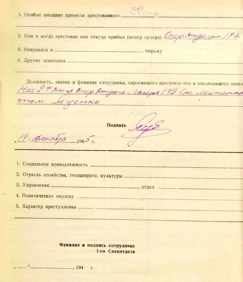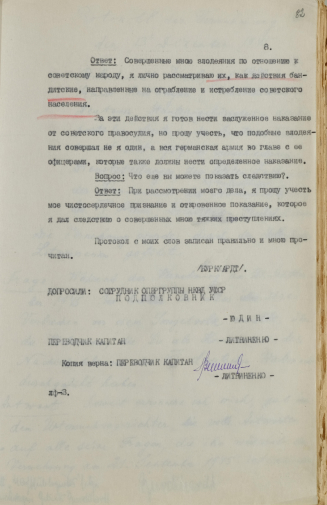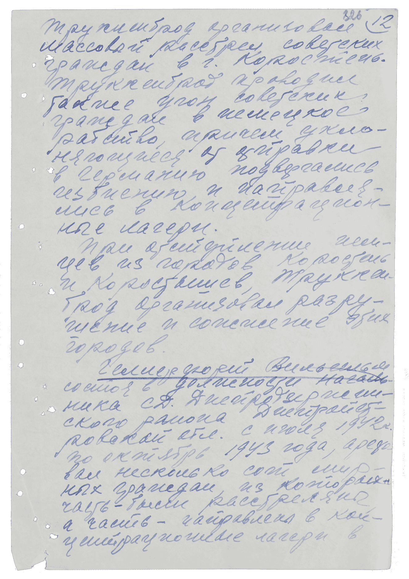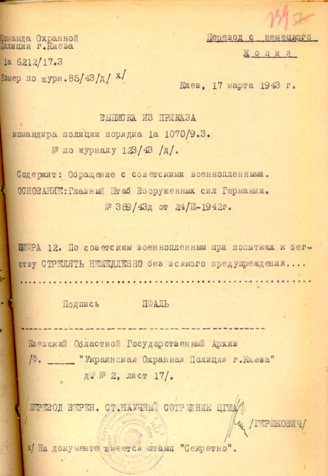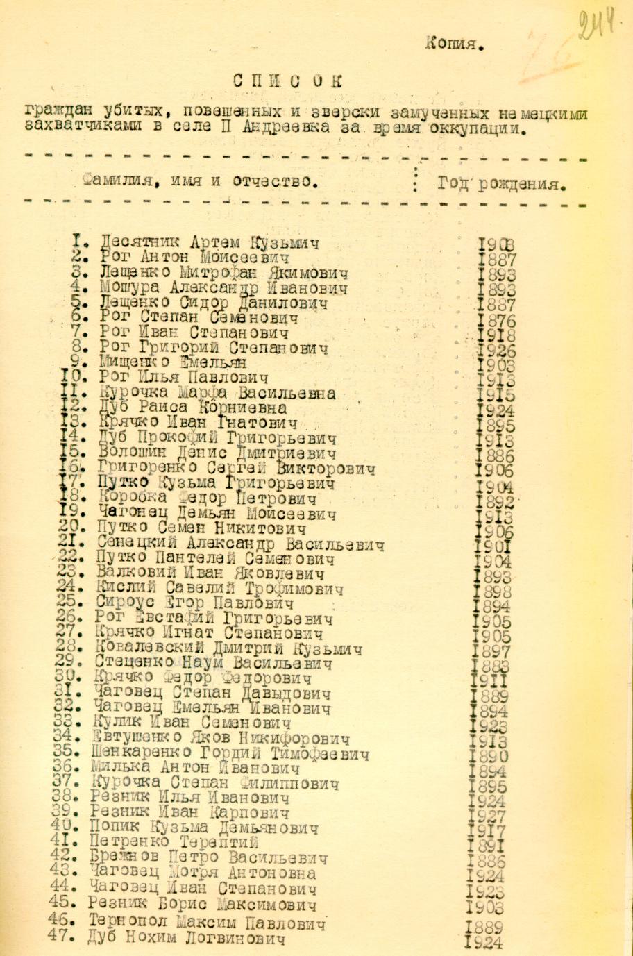 Будучи комендантом лагеря военнопленных в с. Андреевка, Балаклеевского района, Харьковской области создал в лагере такие условия для военнопленных, в результате коих значительное количество пленных умерло голодной смертью: раненым никакой помощи не оказывалось, много пленных оказалось обмороженными...