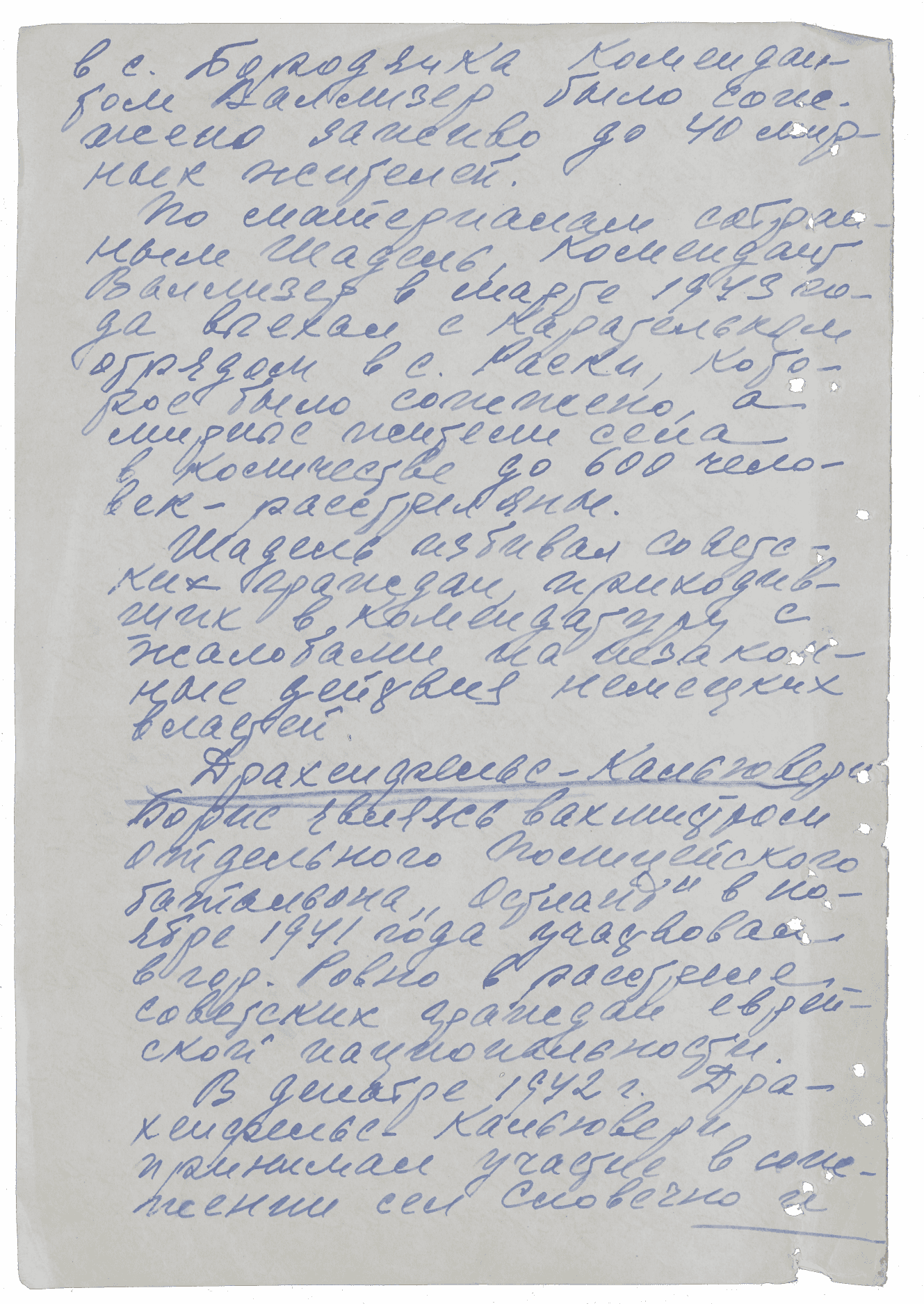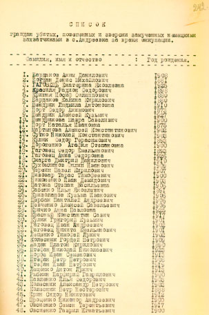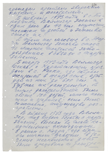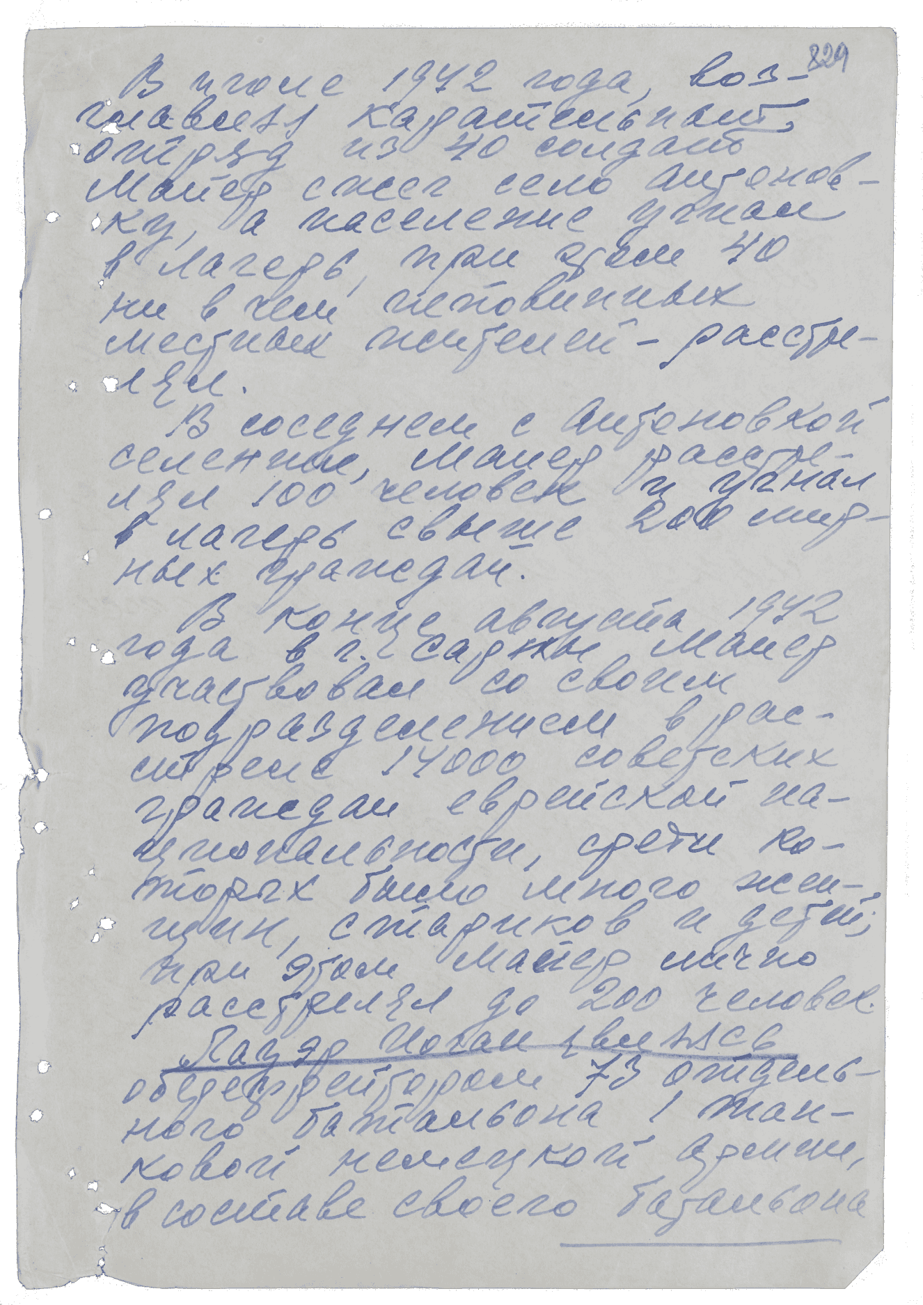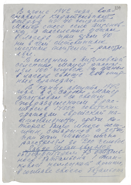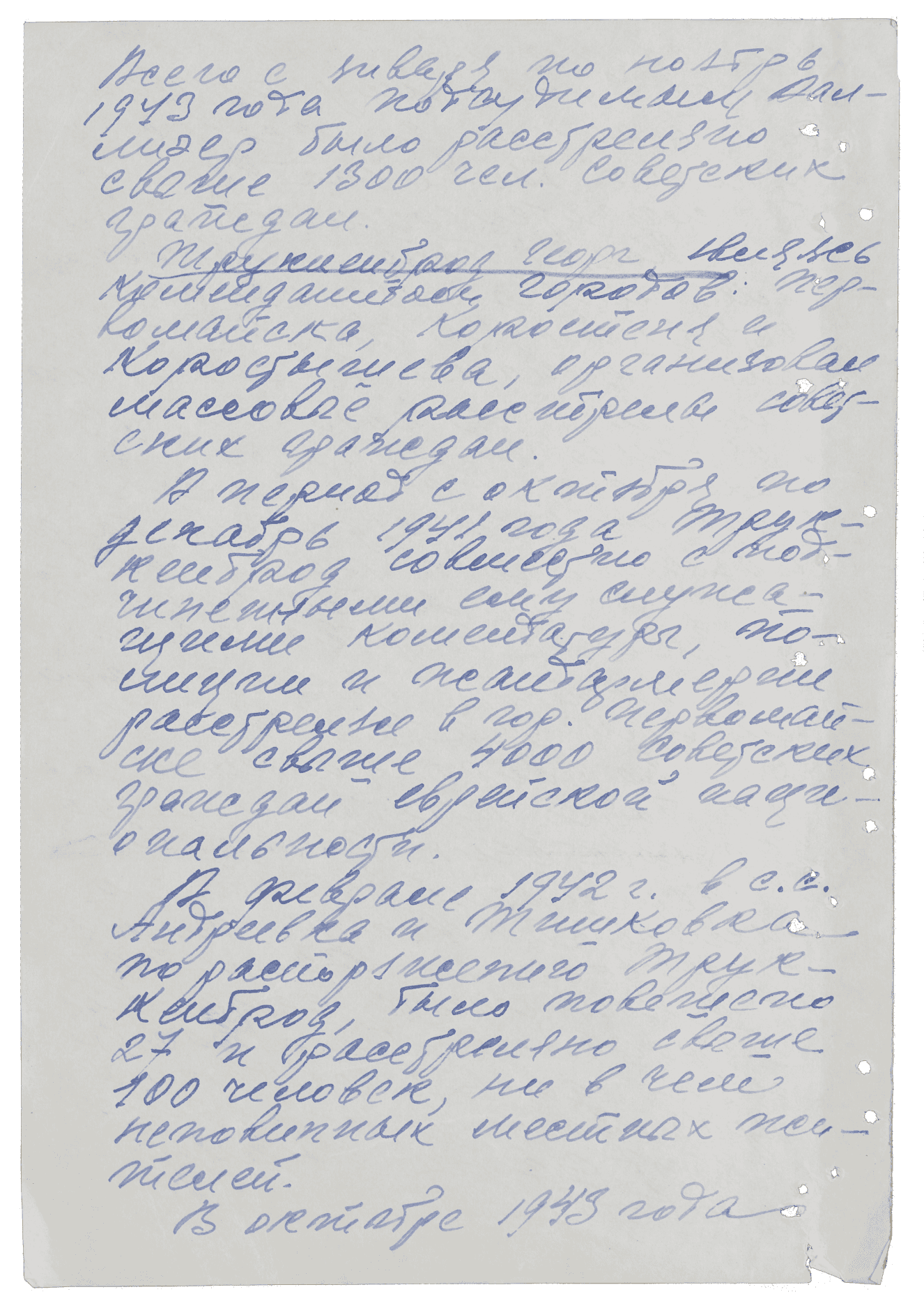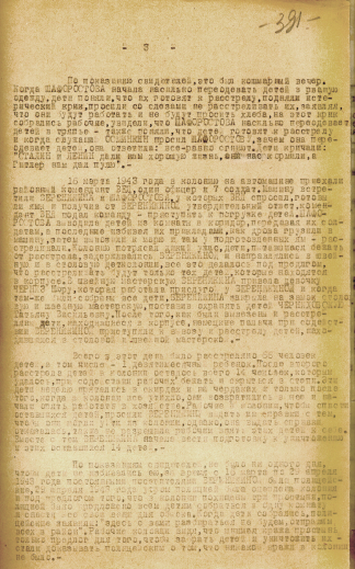 Я лично видел, как обезумевшие матери с грудными детьми на руках молились о пощаде, но они безжалостно расстреливались. Над местом расстрела стоял стон и крики женщин и детей. Место расстрела, а также улицы города были оцеплены солдатами нашего 558 охранного батальона».