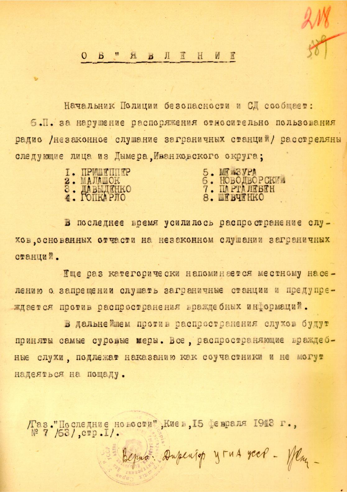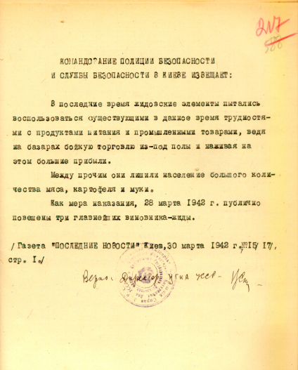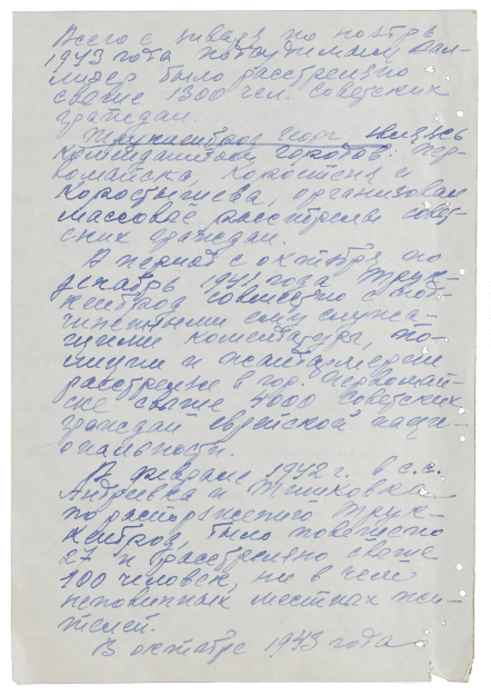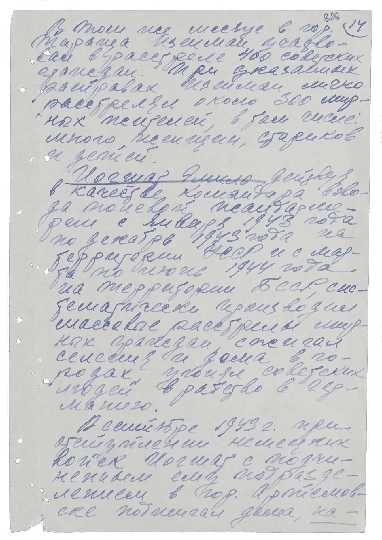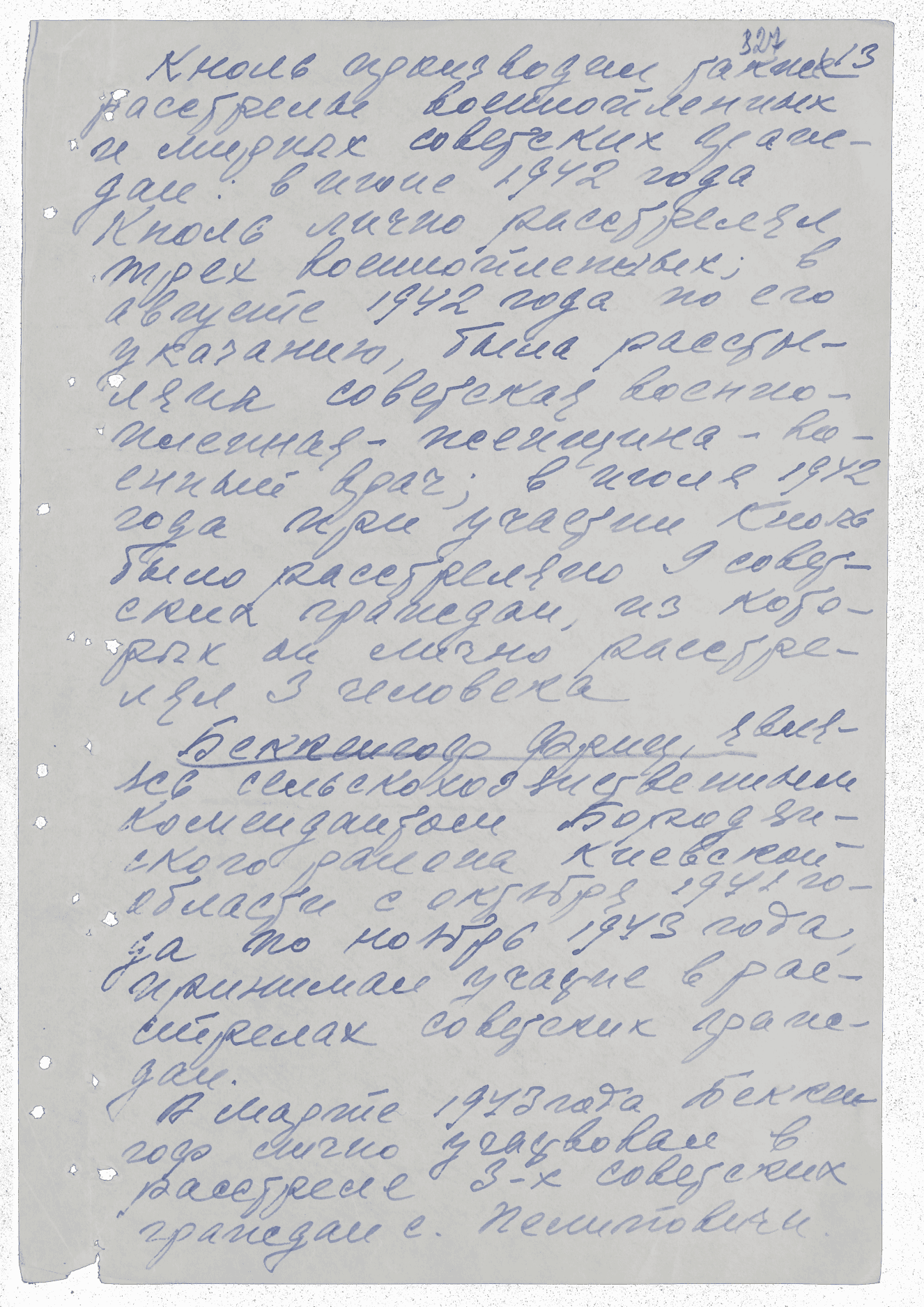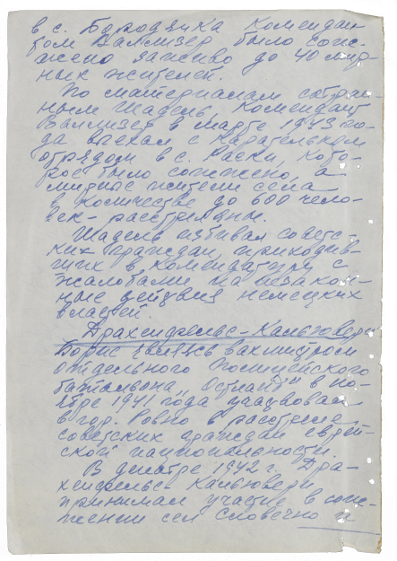 Я лично видел, как обезумевшие матери с грудными детьми на руках молились о пощаде, но они безжалостно расстреливались. Над местом расстрела стоял стон и крики женщин и детей. Место расстрела, а также улицы города были оцеплены солдатами нашего 558 охранного батальона».