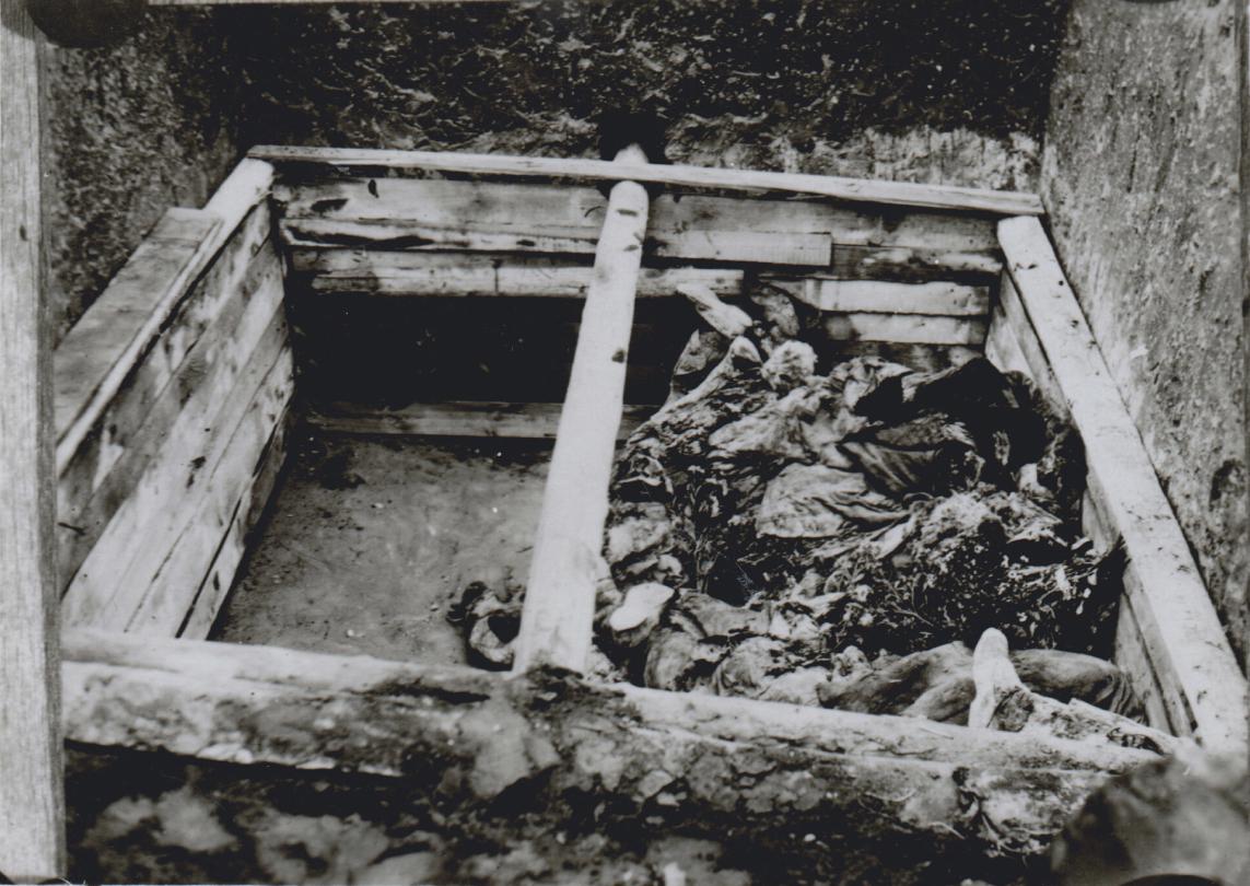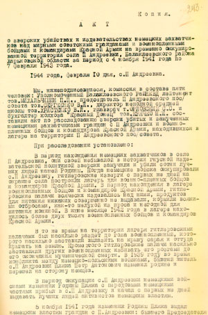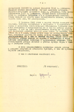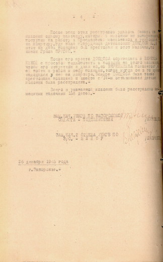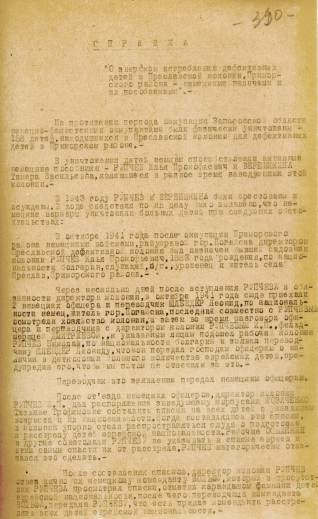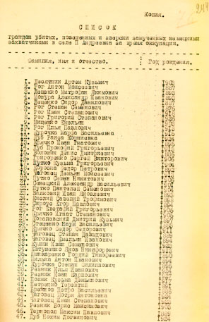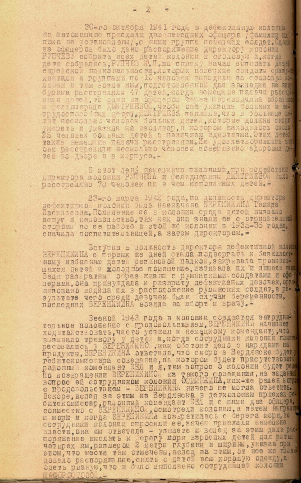 .. Дети находились в столовой колонии, где их вызывали по списку и группами по 5-6 человек фашистские солдаты водили к яме, которая находилась здесь же, примерно в 40 метрах. Около ямы стояли 4 гестаповца, которые производили расстрел. Когда детей подводили к яме, солдаты заставляли прыгать их в яму, а тех, кто сопротивлялся, били прикладом, силой бросали в яму и затем расстреливали...