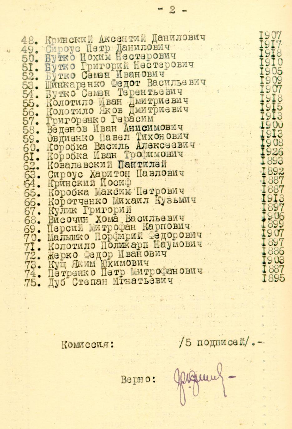 После расстрела, когда фашисты отошли от ямы, я вместе с другими бывшими работниками колонии - Мальчевским и Ботиным - подошли к яме и увидели, что некоторые из детей были ещё живы, слышны были стоны раненых, находящихся в яме. Я крикнул стоявшей невдалеке от ямы фельдшеру Дмитриевой: «В яме ещё находятся живые люди, как быть?». Дмитриева подошла ближе к яме и сказала: «Закапывайте их так. Что мы с ними будем делать? Узнают немцы - нам попадёт за это». Таким образом, в яме были засыпаны живые, раненые дети...