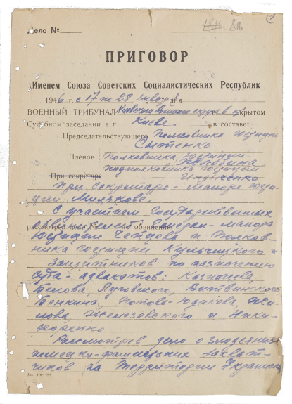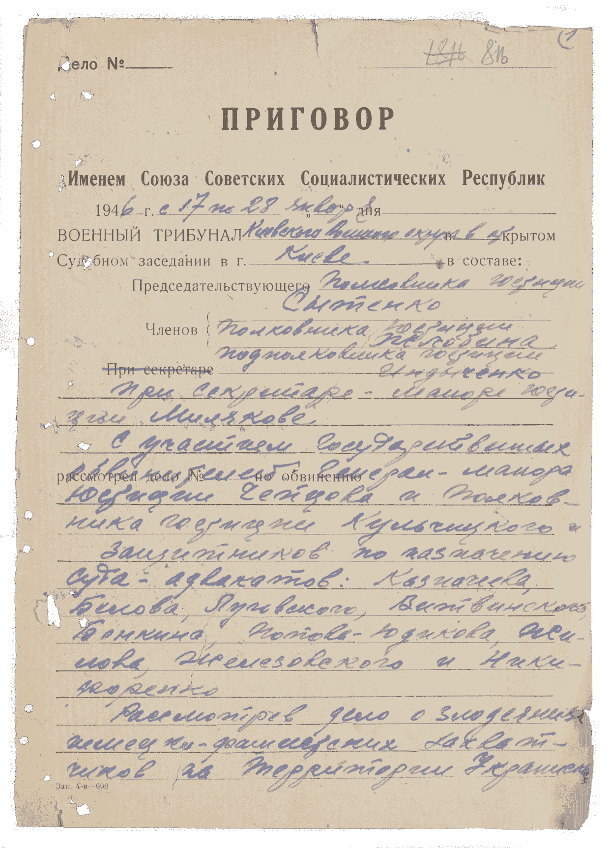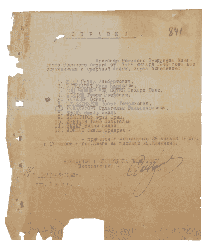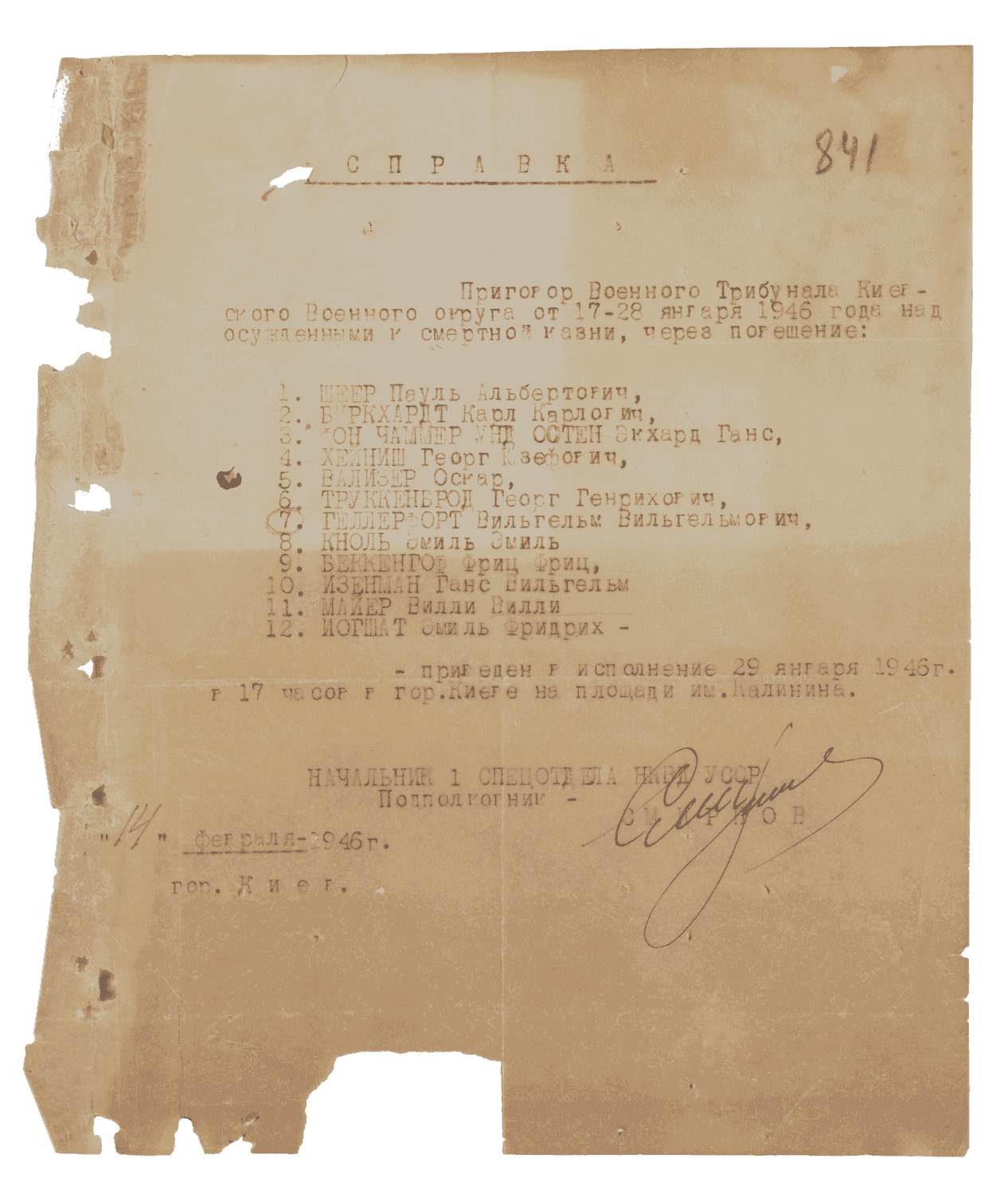 29 января 1946 в Киеве на площади Калинина (майдан Незалежности) приговор над осужденными к смертной казни был приведен в исполнение.