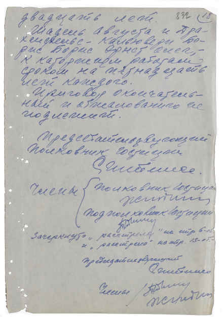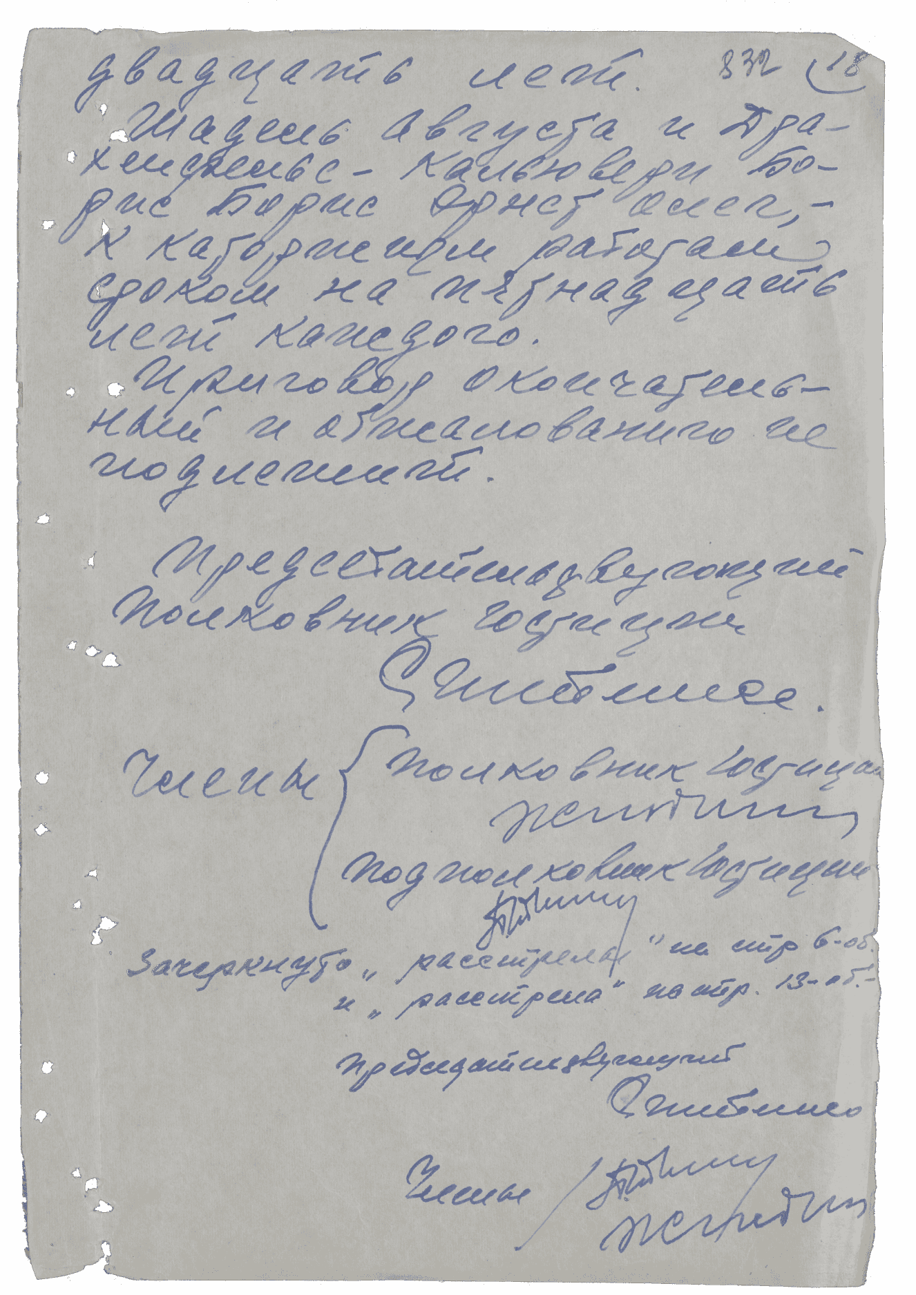 Свидетельница Букина: «Меня поставили на доску, на которой была натянута парусина, когда я на нее стала, иглы моментально вонзались в ступни моих ног, я потеряла сознание. Сразу же после этой пытки меня заставили стать в таз с водой, имеющий густой раствор соли. Я испытывала неимоверные муки».