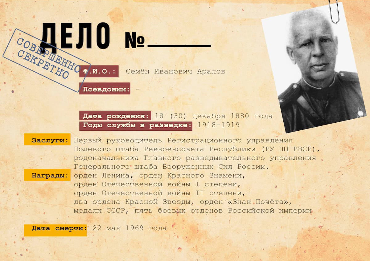 Первым начальником военной разведки был Аралов Семён Иванович, комиссар Полевого штаба РВСР, бывший штабс-капитан.
