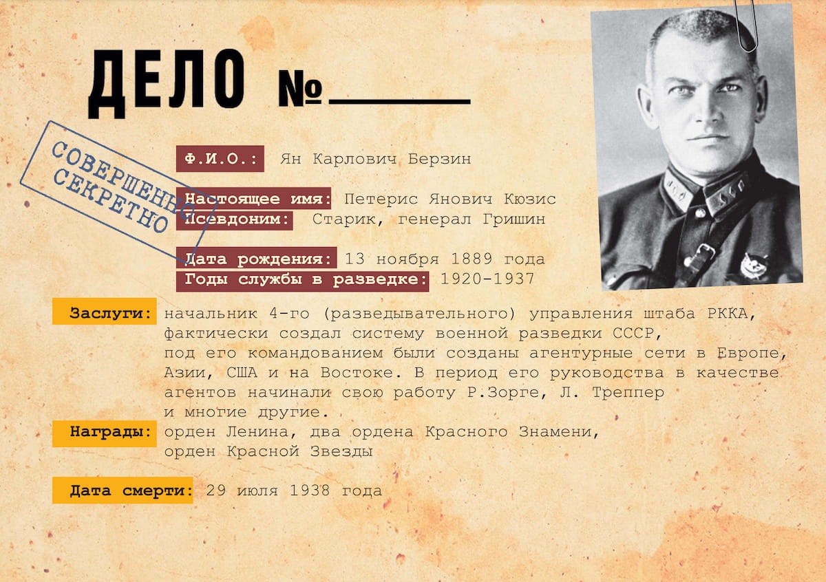 В 1924 году на пост руководителя Разведотдела был назначен Петерис Кюзис - латышский коммунист, более известный в истории военной разведки как Ян Карлович Берзин.