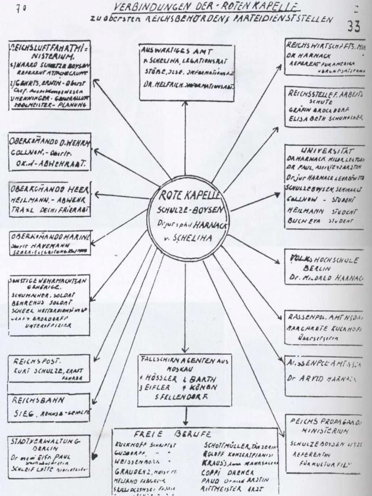 Набросок схемы «подпольных связей» «Красной Капеллы» из заключительного отчета германского Главного управления имперской безопасности по делу этой организации.