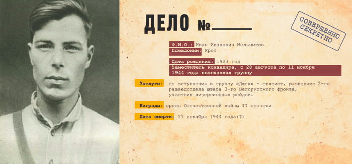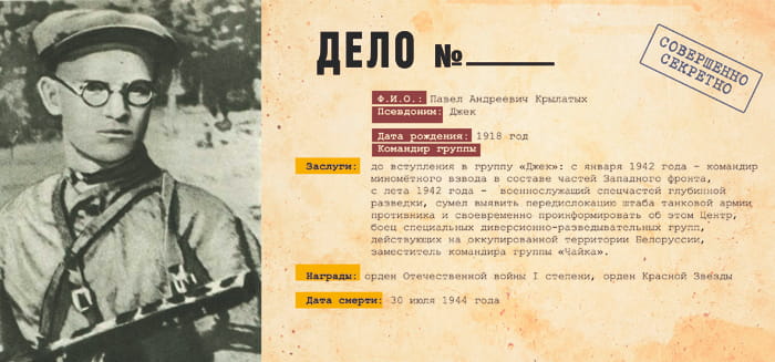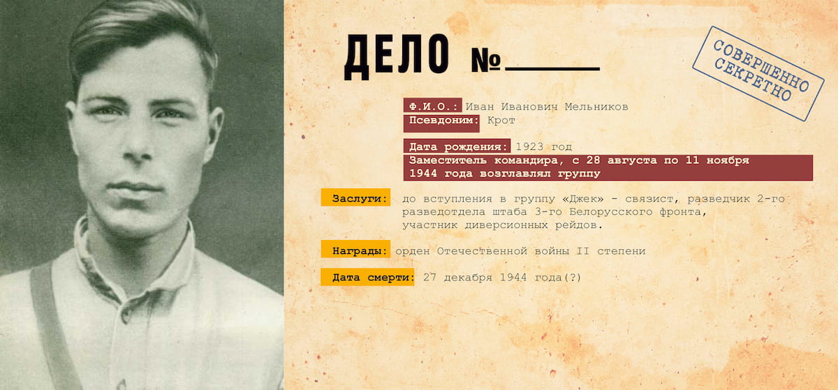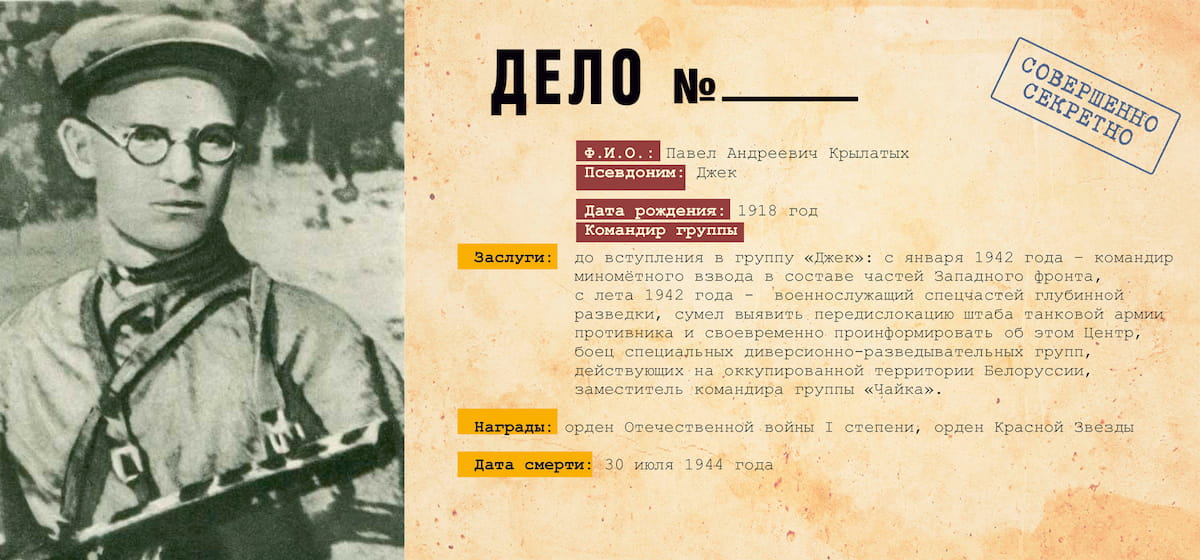 «Джек» - одна из самых успешных диверсионно-разведывательных отрядов, действовавших в тылу врага. Действовала с июля по декабрь 1944 года на территории Восточной Пруссии. Основными задачами группы стали: установление контроля за железнодорожными и шоссейными дорогами; систематический захват «языков»; освещение сосредоточения войск, техники, вооружения, боеприпасов, горючего, продовольствия и других видов снабжения; своевременное обнаружение мероприятий противника по подготовке к химической войне; освещение намерений противника по дальнейшему ведению операций и др. Численность группы составляла всего 10 человек (позже, в связи с гибелью руководителя группы, в отряд был направлен новый командир). Младшему участнику на момент операции было всего 16 лет.
