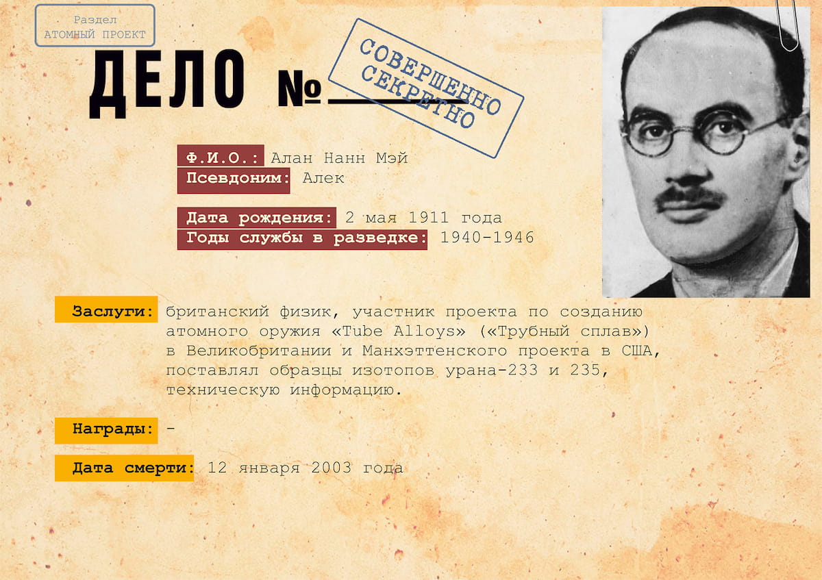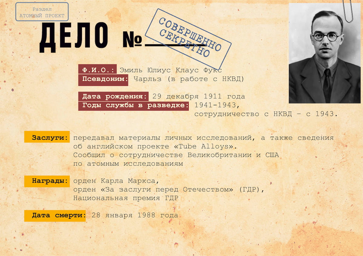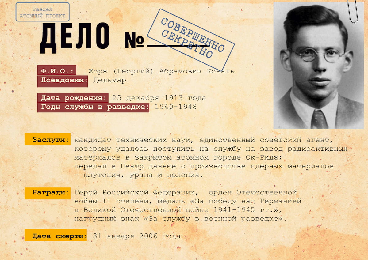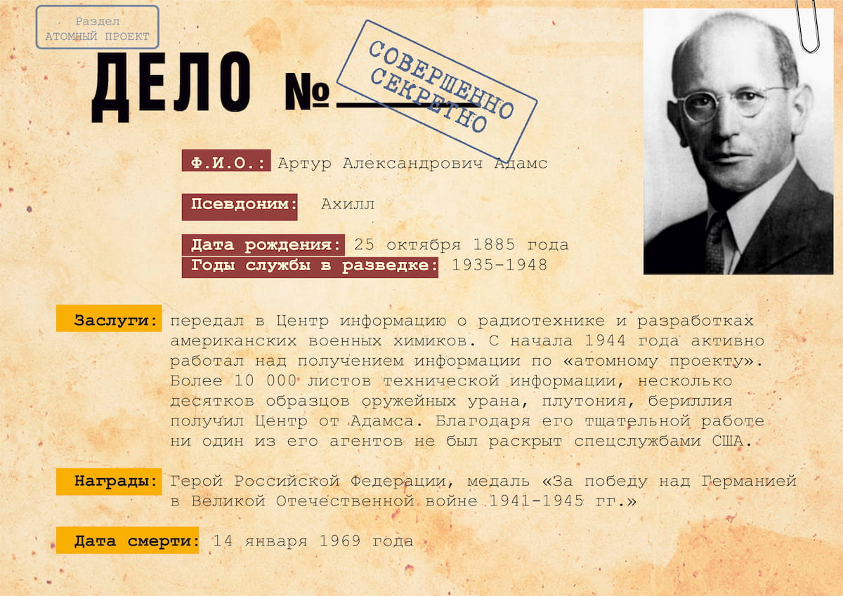 Военная разведка не перестала функционировать после окончания Второй Мировой войны. Уже в 1941 году сотрудникам ГРУ, как и руководству страны, было известно о разработках нового атомного оружия. На атомные проекты и разработки руководством Великобритании и США выделялись огромные средства из особого секретного фонда, а для обеспечения информационной безопасности предпринимались беспрецедентными меры. Тем не менее советские агенты смогли не только узнать подробную информацию о проекте, но и принять участие в создании атомного оружия на засекреченных объектах, оставаясь нераскрытыми. В «атомном шпионаже принимали участие многие разведчики, однако наиболее успешными оказались действия Я. Черняка, руководившего сетью «Крона» в Европе, А. Адамса и Ж. Коваля.