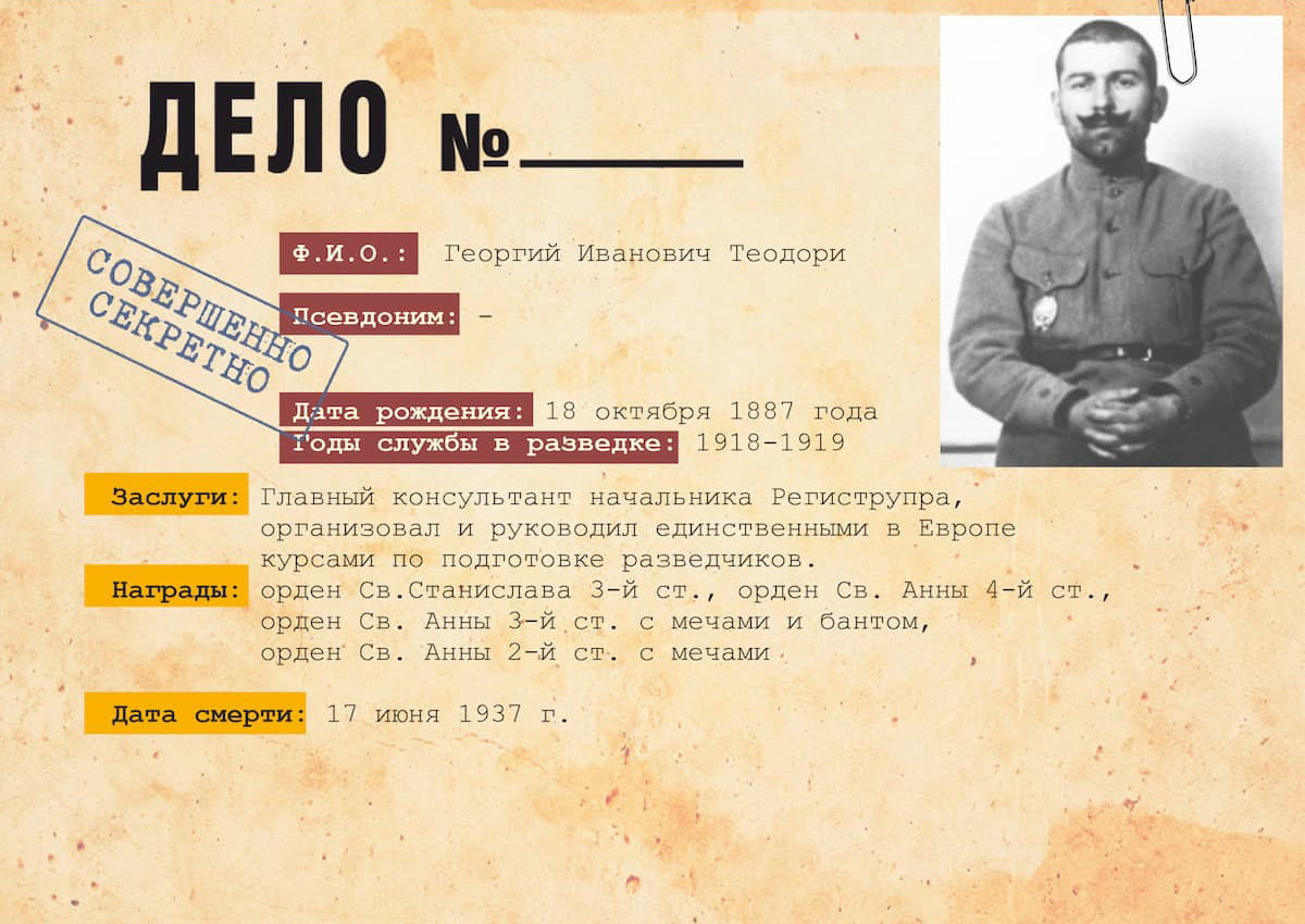 Уже 21 ноября 1918 г. начали работу первые советские и единственные в Европе «Курсы разведки и военного контроля» под руководством Г.И. Теодори.