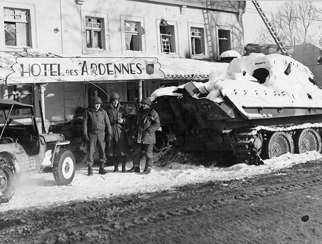16 декабря 1944 г. немецкие войска нанесли контрудар в бельгийских Арденнах, прорвав фронт на 80-км участке. Продвижение танков было настолько стремительным, и потери, главным образом американцев, столь большими (61,4 тысячи убитыми, ранеными, пленными), что в рядах Союзников возникла паника