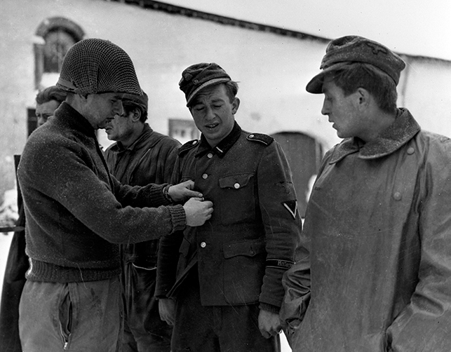 Американский солдат обыскивает штурмана 12-й танковой дивизии СС «Гитлерюгенд», взятого в плен в районе Бастони