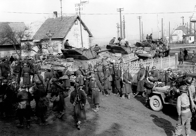 В марте 1945 г. союзники форсировали Рейн, обошли с юго-востока Рур и в начале апреля окружили 29 немецких дивизий и одну бригаду. В преддверии массовых встреч союзников и Красной Армии для американских солдат была выпущена специальная методичка, разъяснявшая, как выглядят солдаты и техника РККА
