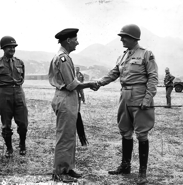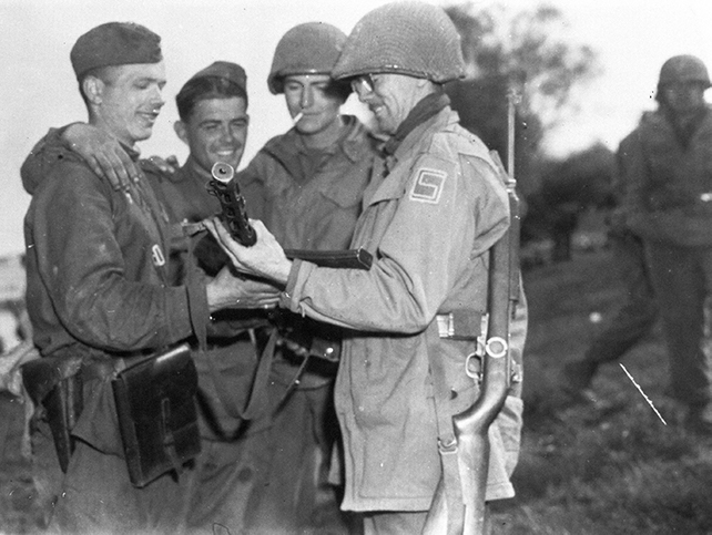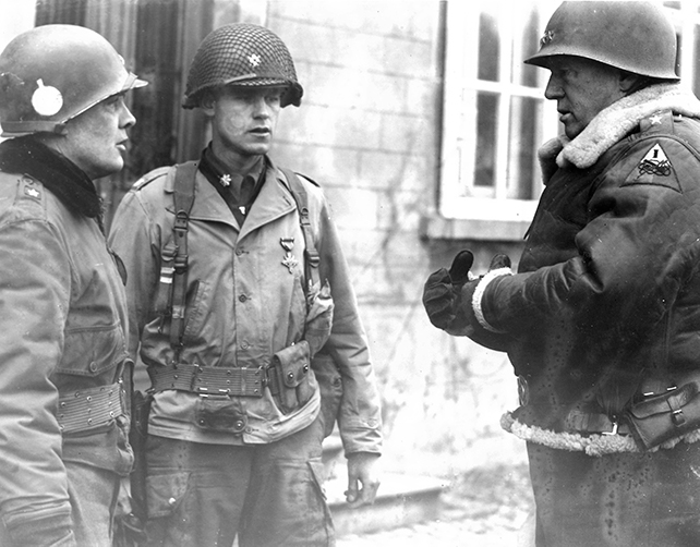 Генерал-лейтенант Дж. Паттон с бригадным генералом Э. Маколиффом (в центре) в освобожденной Бастони