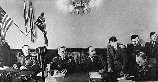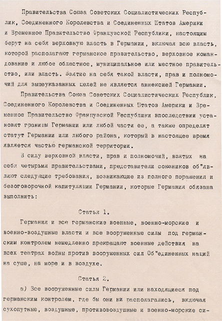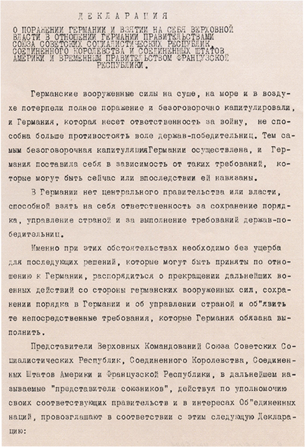 6 июня 1945 г. в Берлине была подписана Декларация о поражении Германии и взятии на себя верховной власти в отношении Германии правительствами СССР, Великобритании, США и Временным правительством Франции