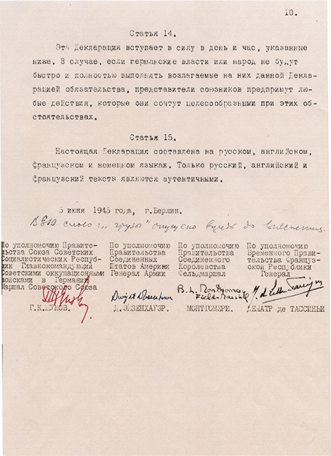 От СССР Декларацию подписал Маршал Советского Союза Г.К. Жуков, от США – генерал Д. Эйзенхауэр, от Великобритании – фельдмаршал Б.Л. Монтгомери, от Франции – генерал Ж.М. де Латр де Тассиньи
