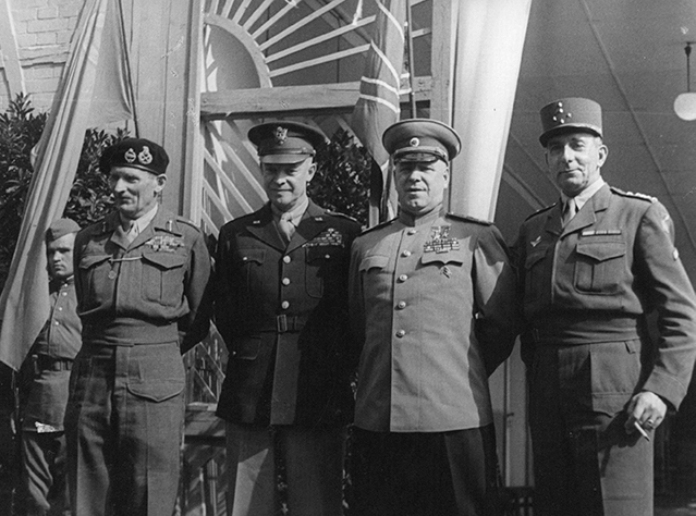 Фельдмаршал Б.Л. Монтгомери, генерал Д. Эйзенхауэр, маршал Г.К. Жуков, генерал Ж.М. де Латр де Тассиньи