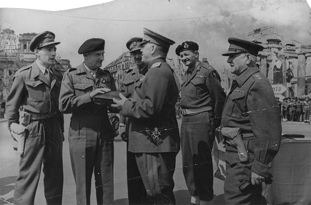 12 июля 1945 г. Маршалы Советского Союза Г.К. Жуков и К.К. Рокоссовский, генерал армии В.Д. Соколовский и генерал-полковник М.С. Малинин и были награждены британскими орденами