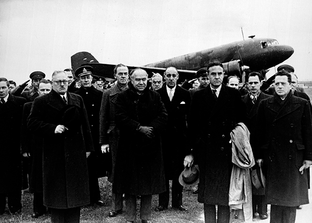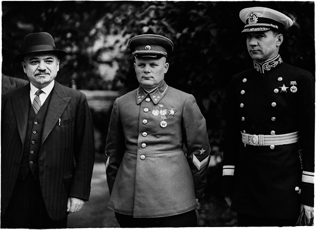 Посол СССР И.М. Майский, глава Cоветской военной миссии генерал-лейтенант Ф.И. Голиков и его заместитель, контр-адмирал Н.М. Харламов. Главные задачи миссии: создание совместного фронта и организация регулярных стратегических поставок по Ленд-лизу