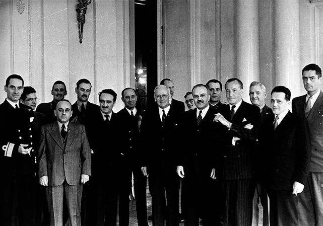 1-й ряд, слева направо: А. Вышинский - замнаркома иностранных дел, председателя СНК СССР, У. Эйткен - глава делегации Великобритании, А. Гарриман – глава делегации США