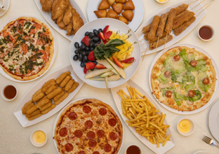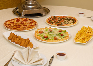 Праздничный стол для именинника и его друзей, на котором после долгого приключения их будет ждать горячая пицца, картофель фри, куриные стрипсы в панировке с соусом, овощная и фруктовая тарелки и, конечно, настоящее чаепитие.